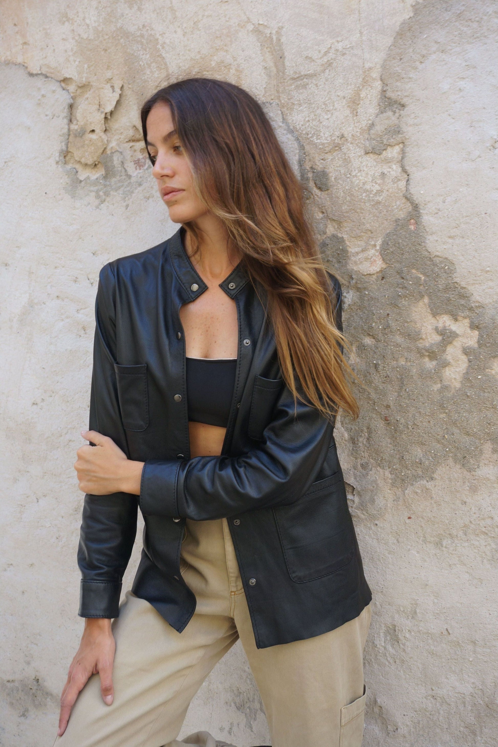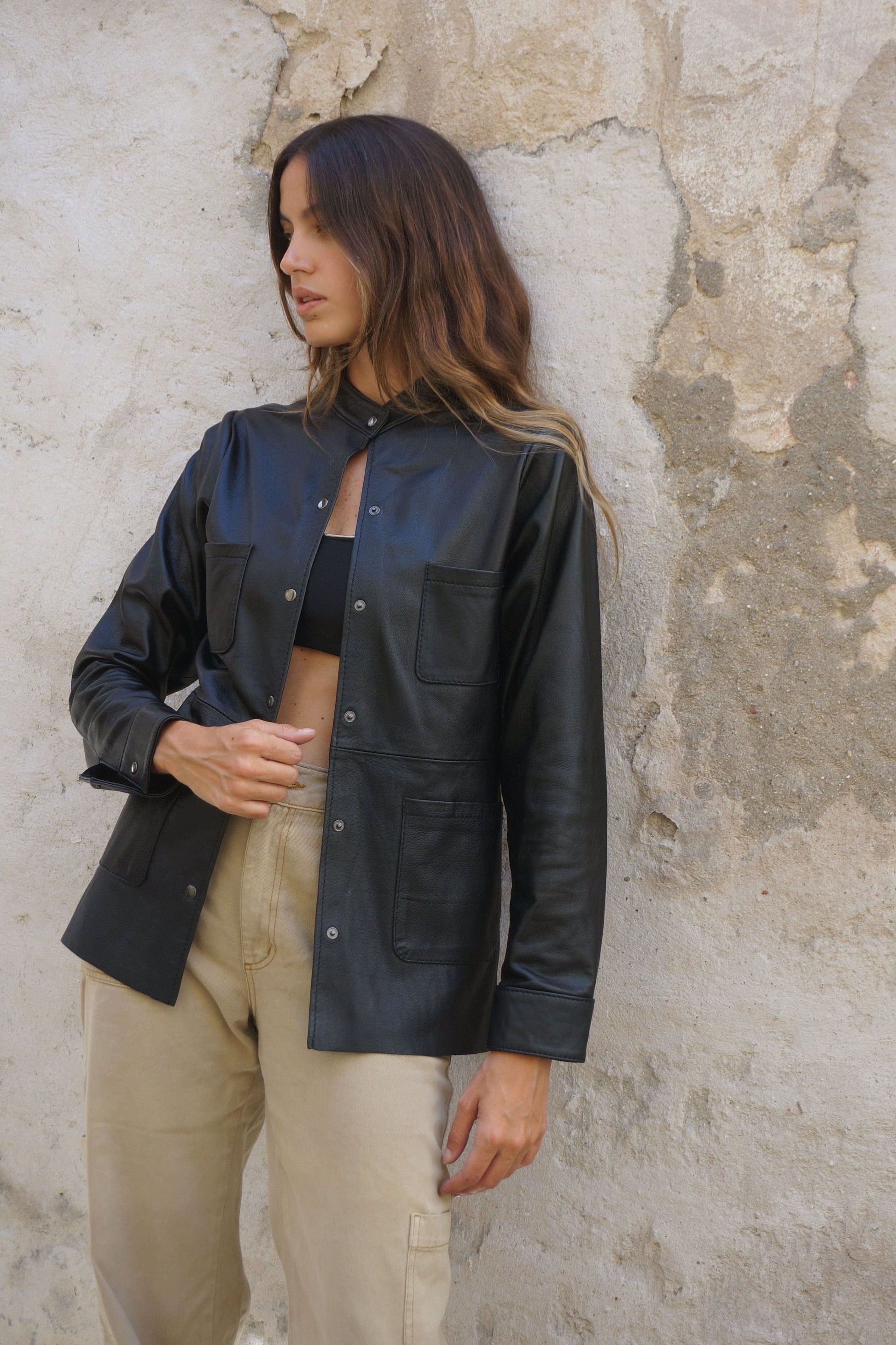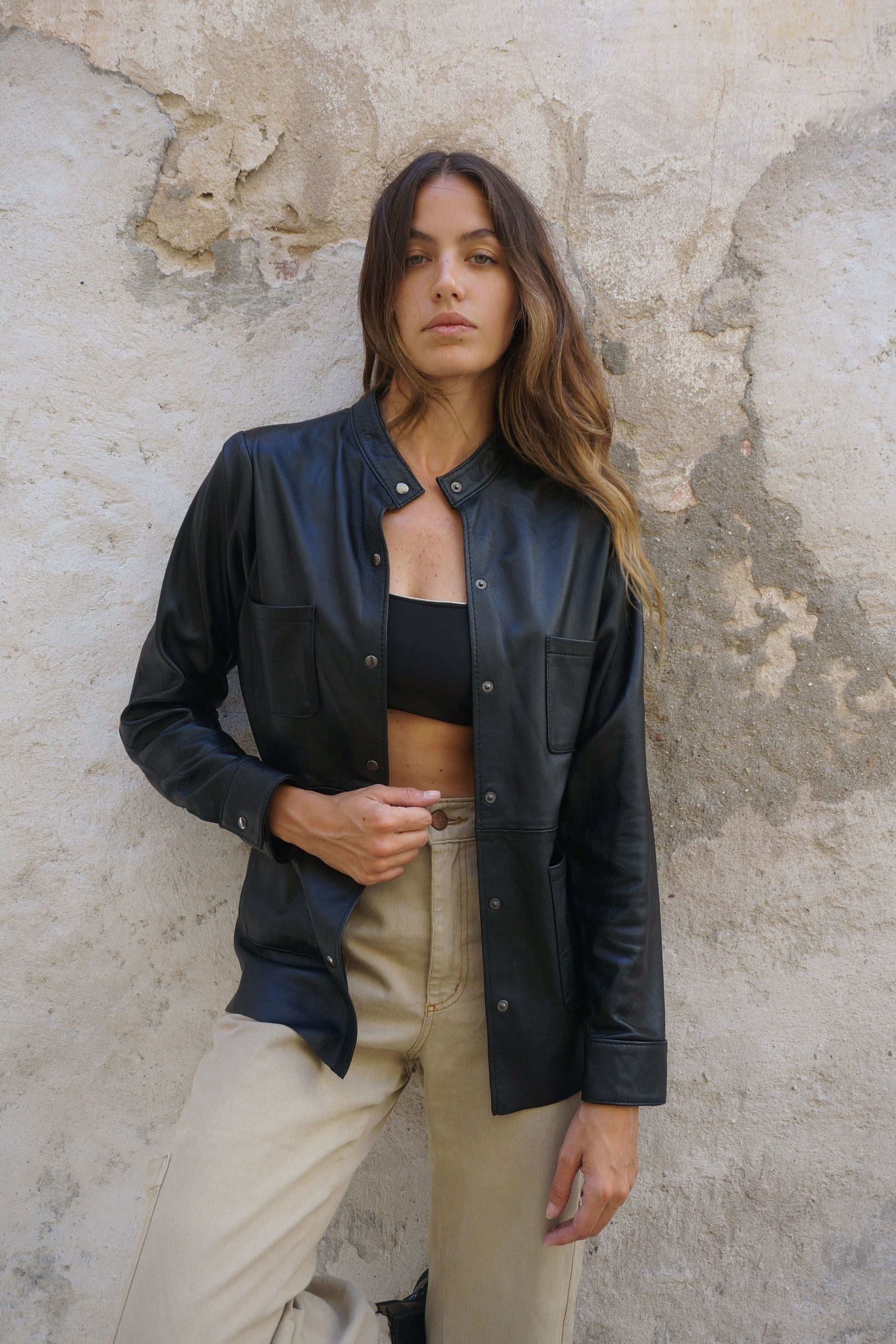 En cuero ovino color visón super suave con tachas oro empavonadas en cuello, bolsillos y mangas.
