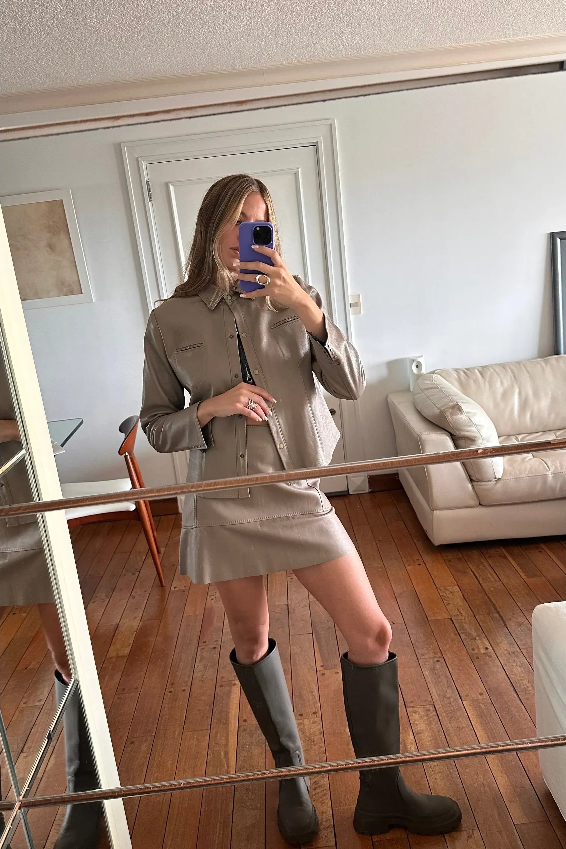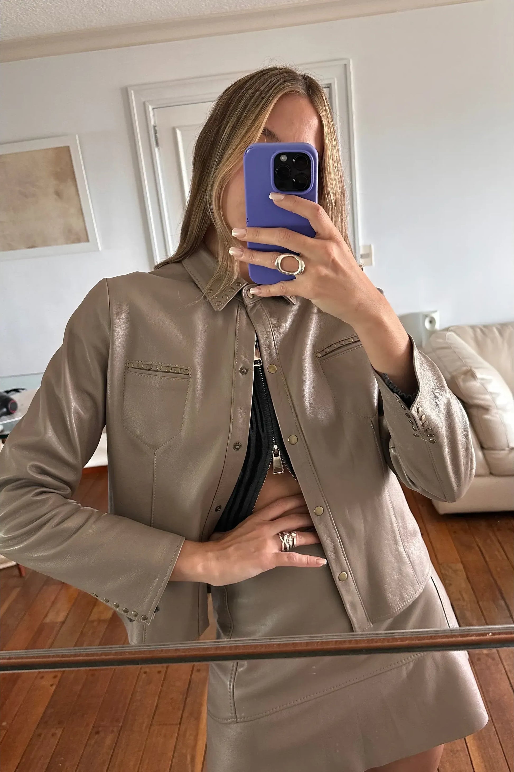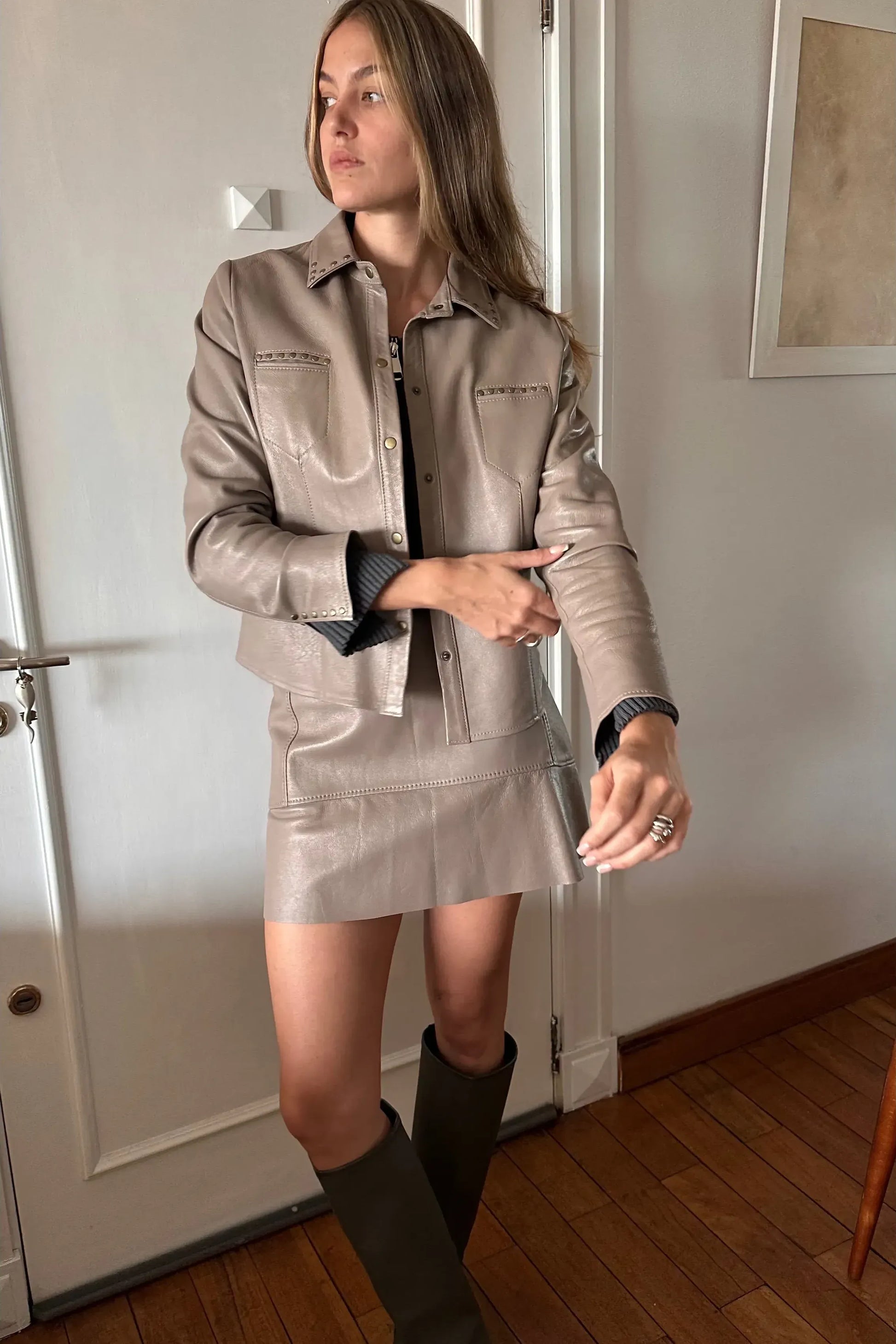 En cuero ovino color visón super suave con tachas oro empavonadas en cuello, bolsillos y mangas.