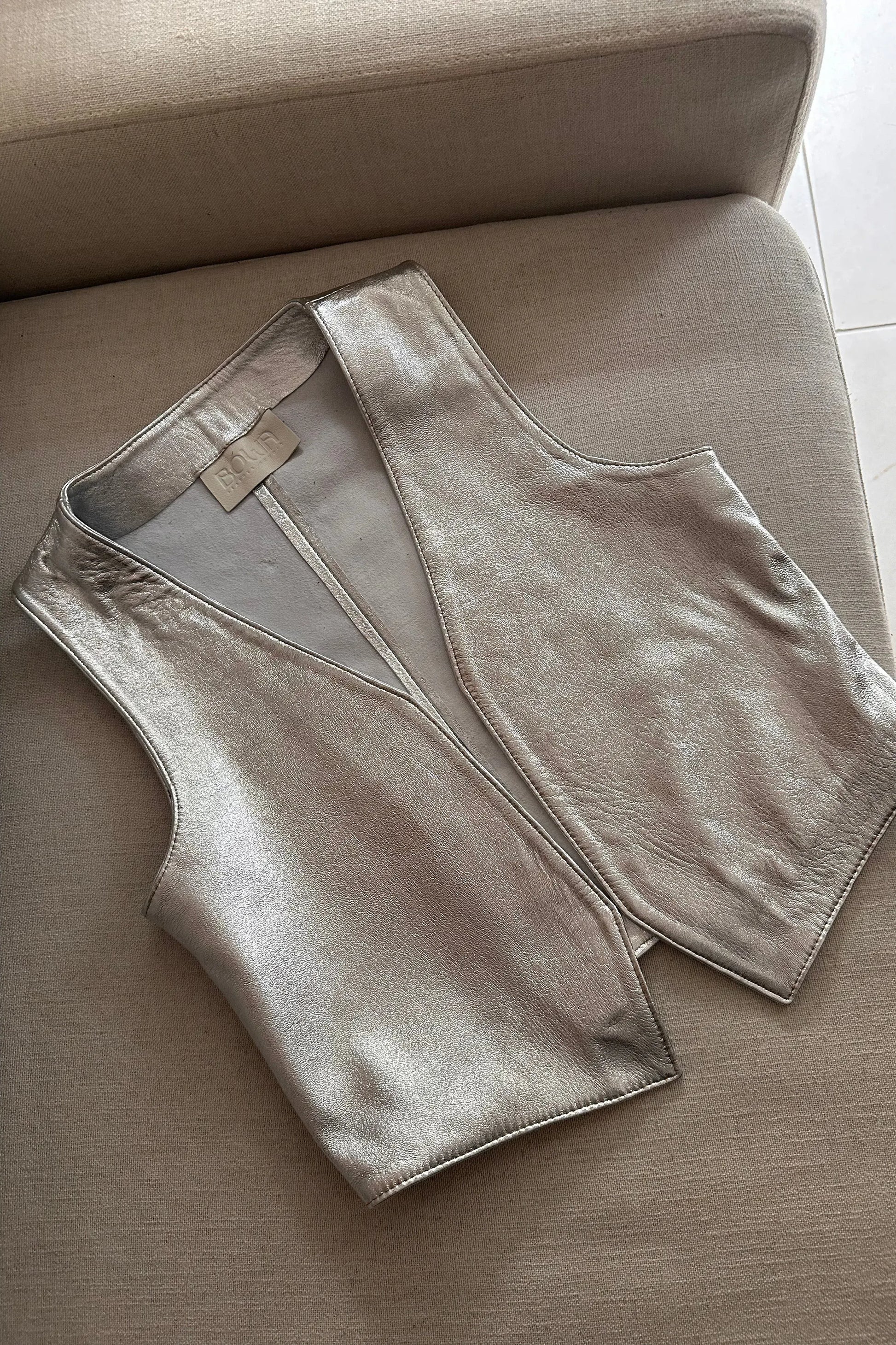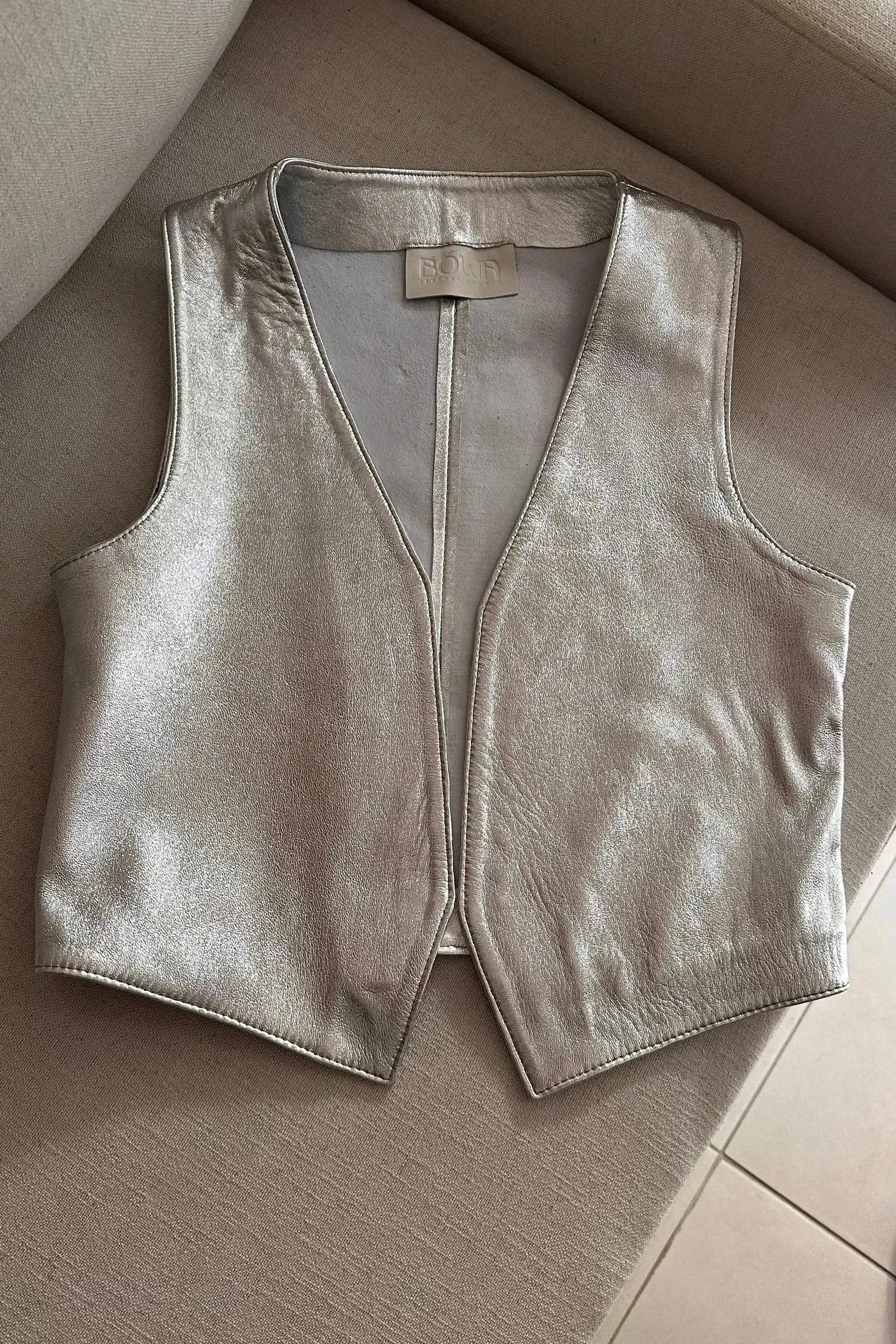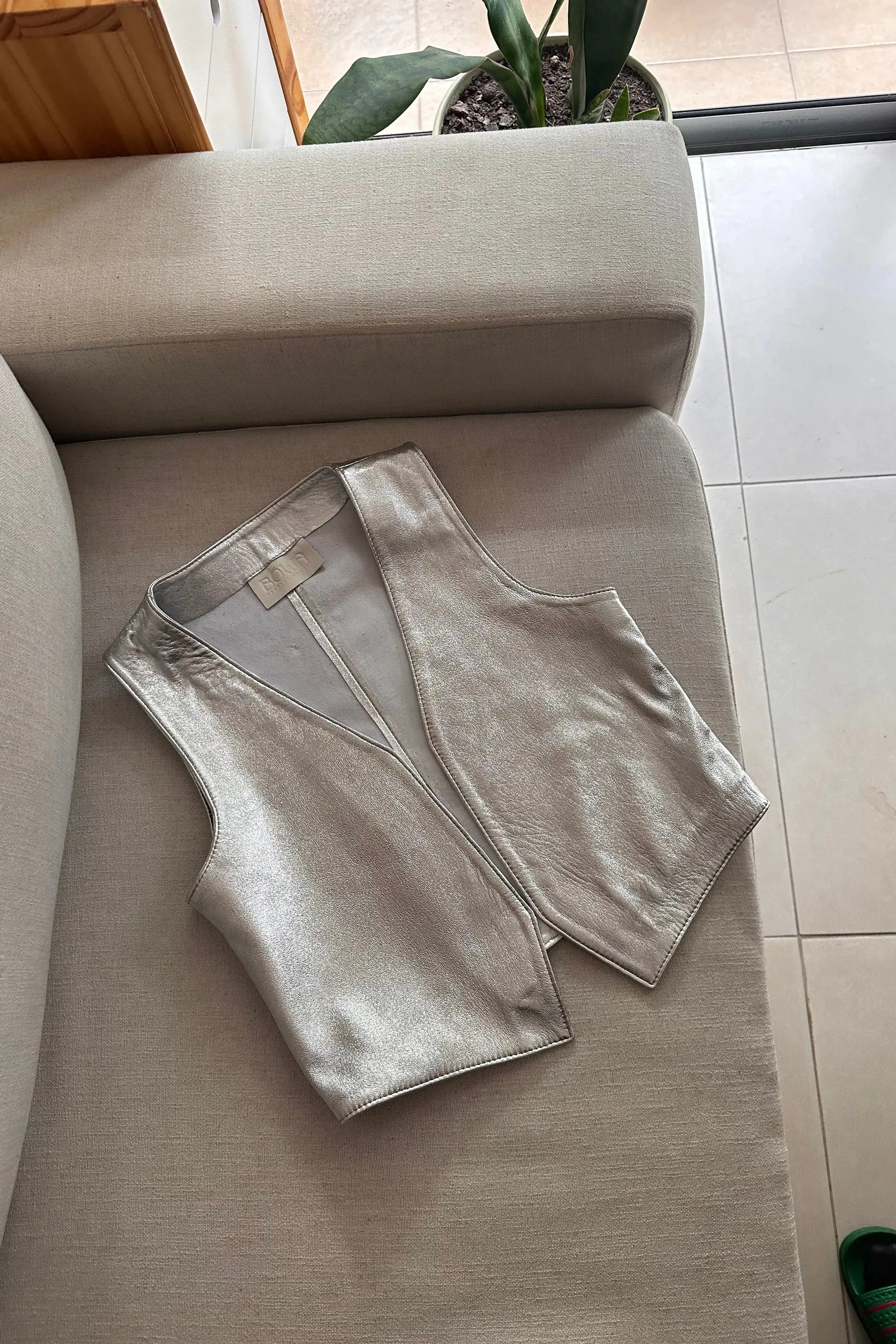 Chaleco en cuero ovino plateado que levanta cualquier look y es muy suave al tacto.