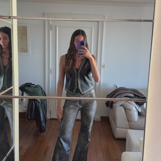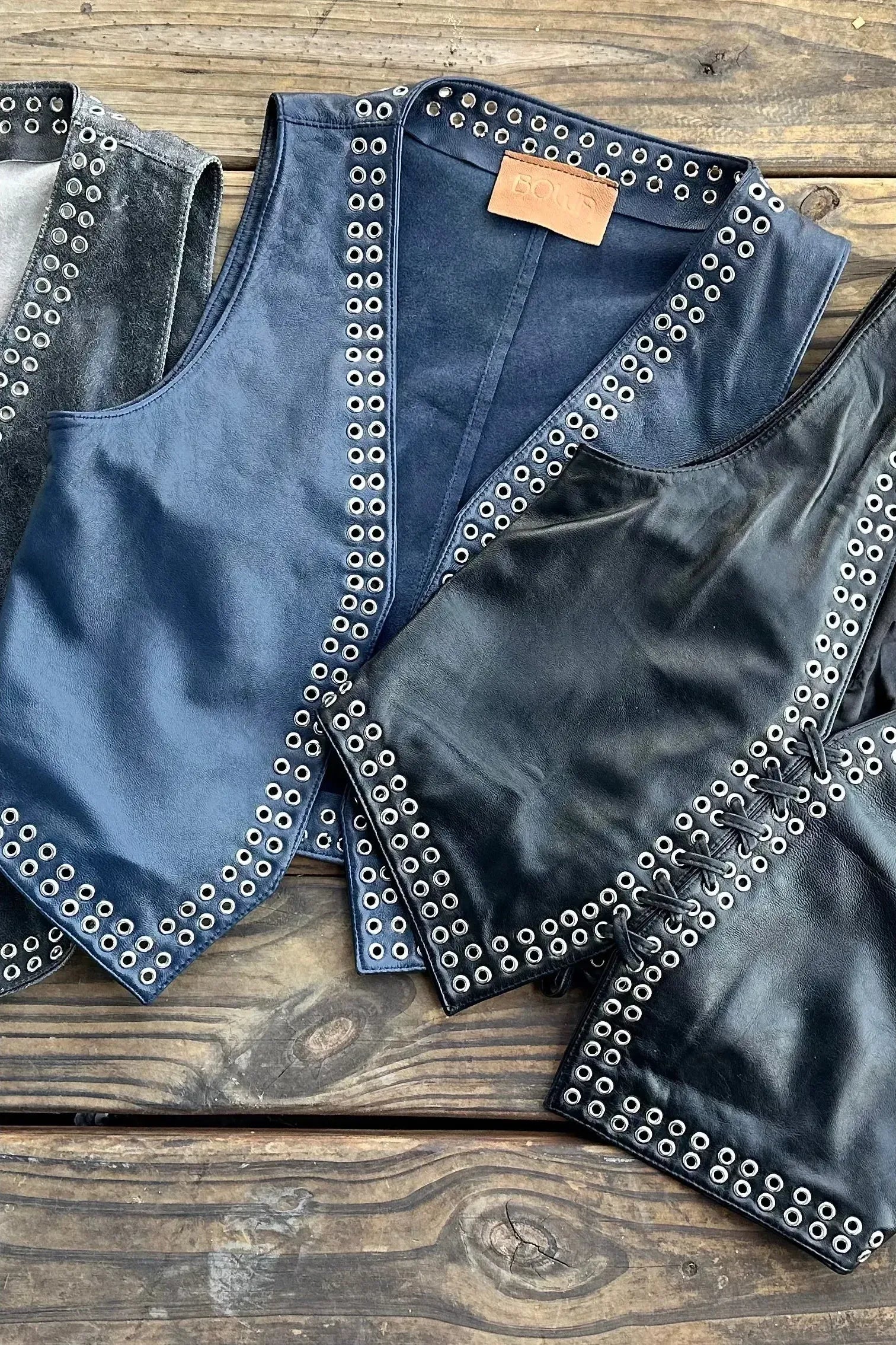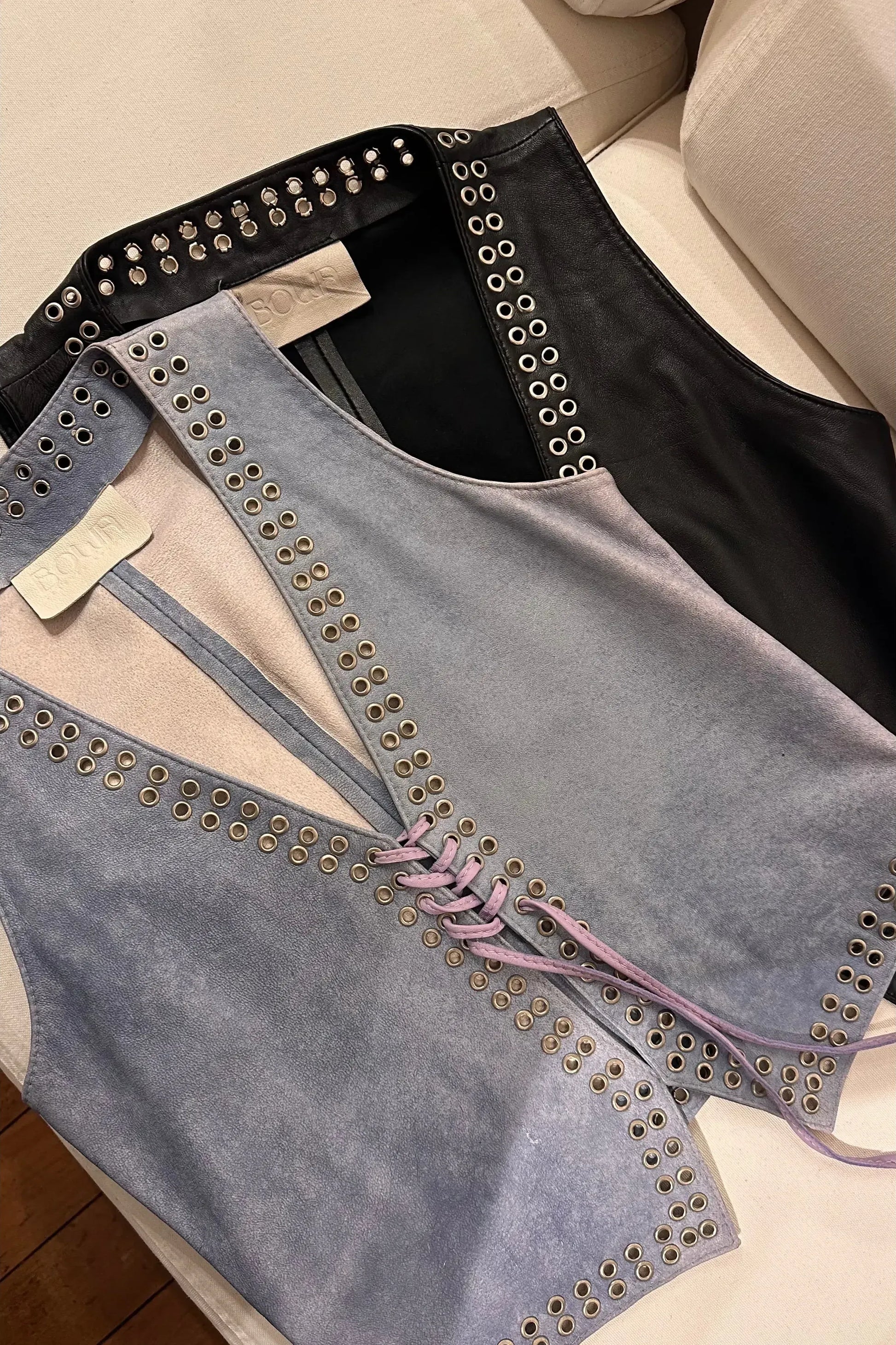 Disponible en cuero negro, azul noche, plata y vintage light blue. Con detalles de ojalillos y tiras para usar cerrado o abierto.