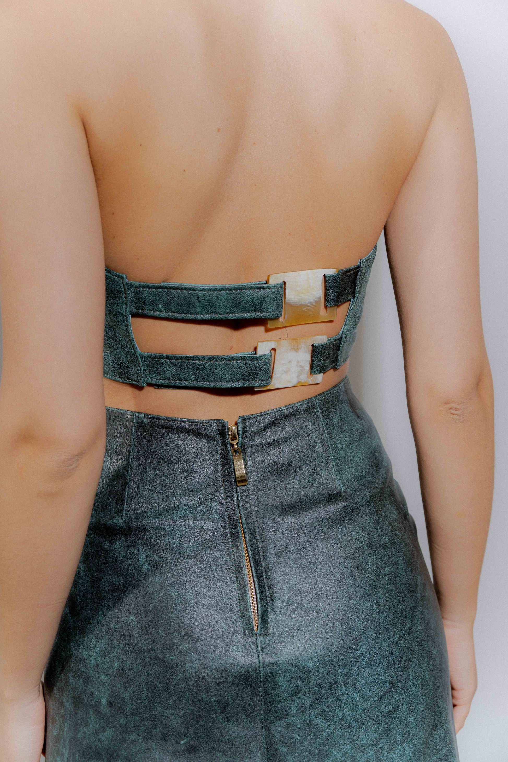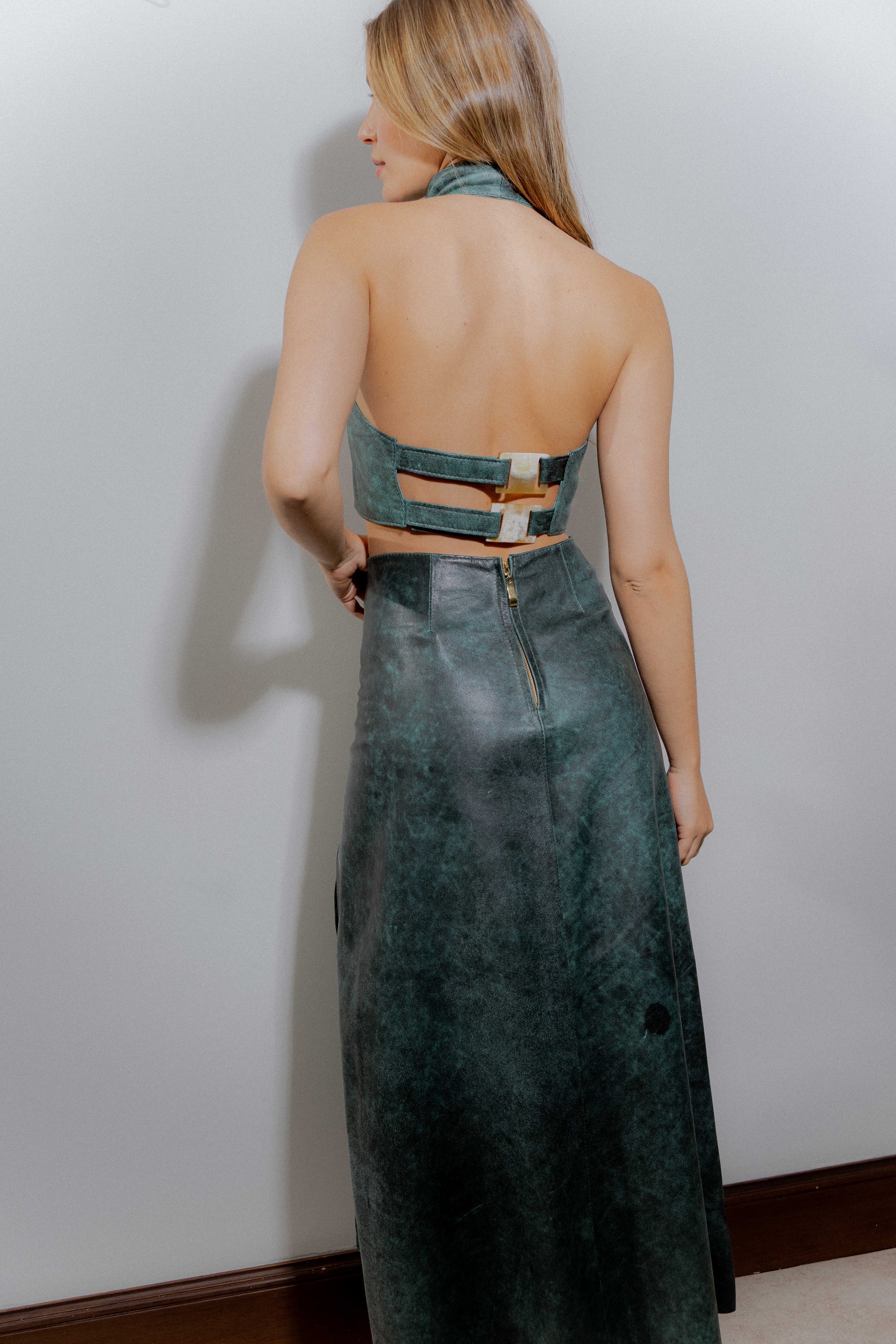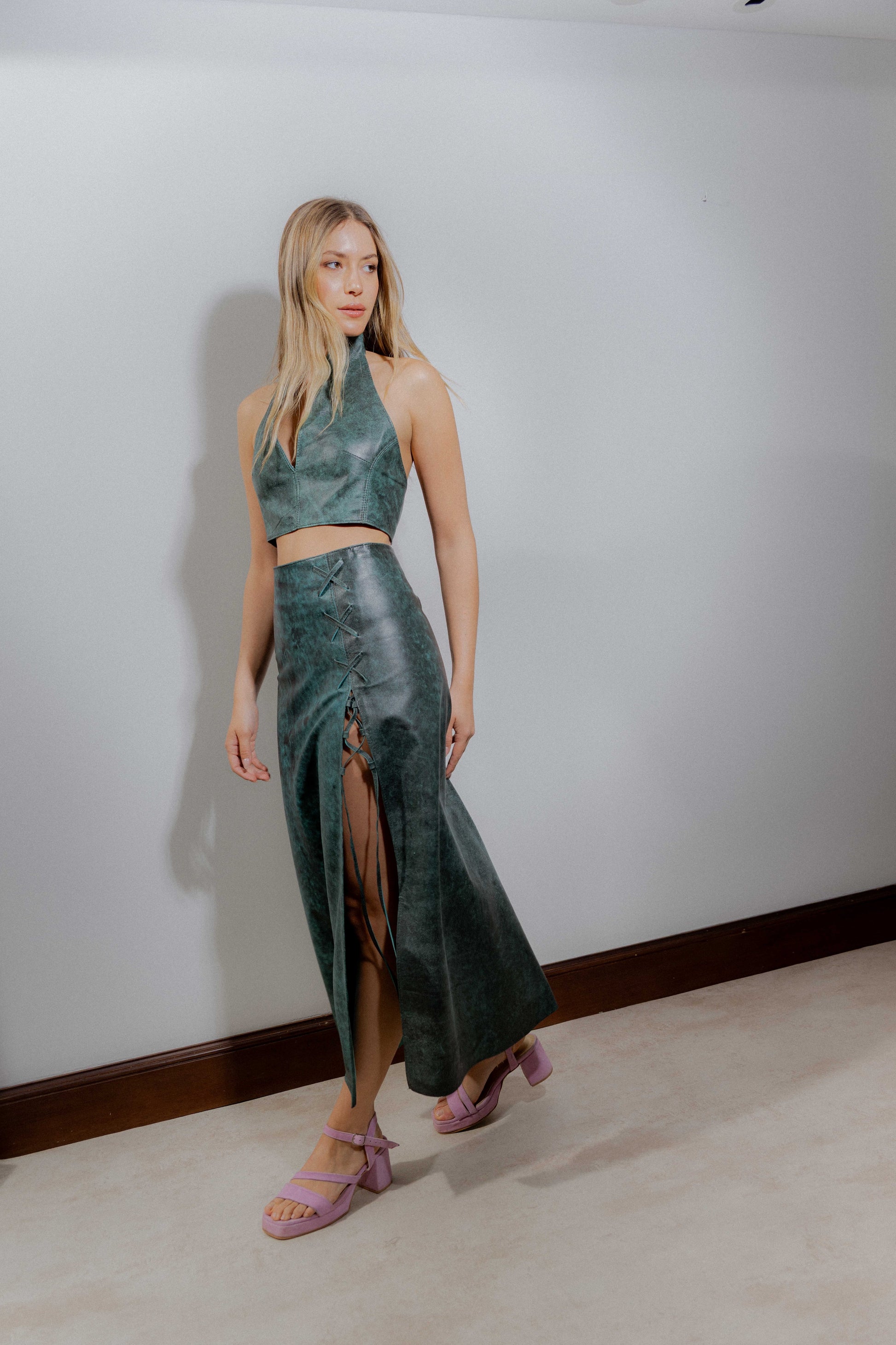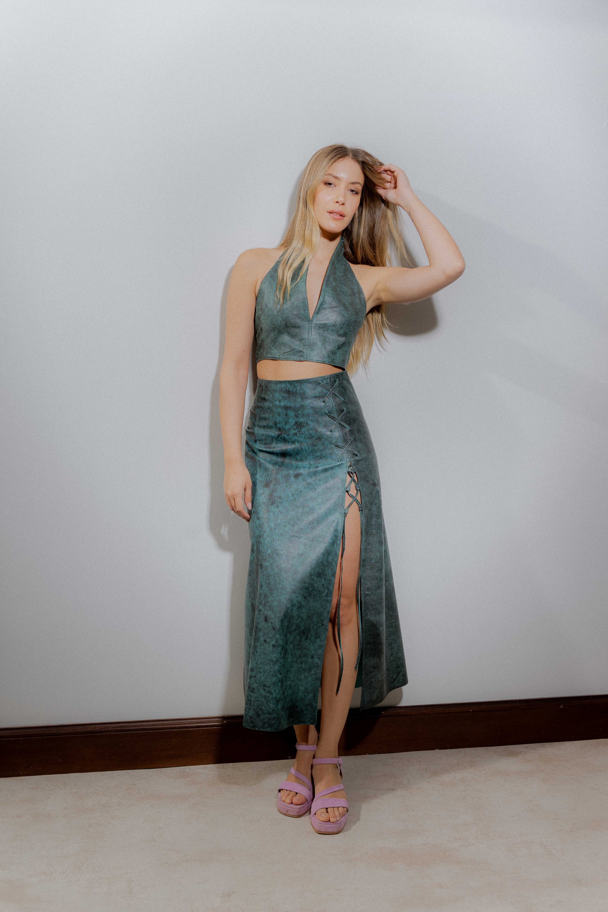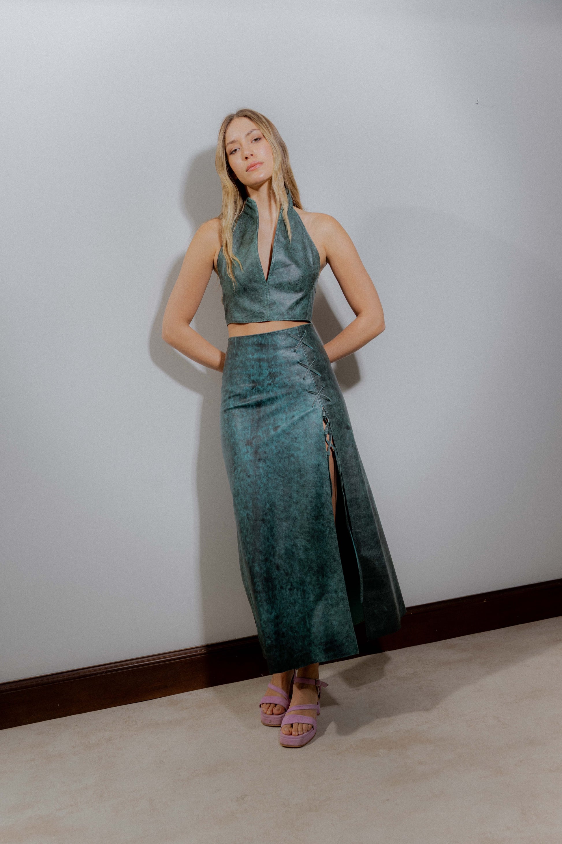 Falda en cuero ovino océano desgastado, con un tratamiento muy original, queda increíble para usar en set con el Top Cat corto.