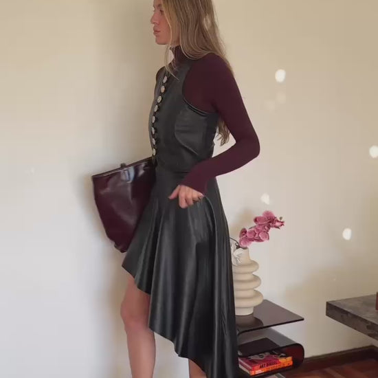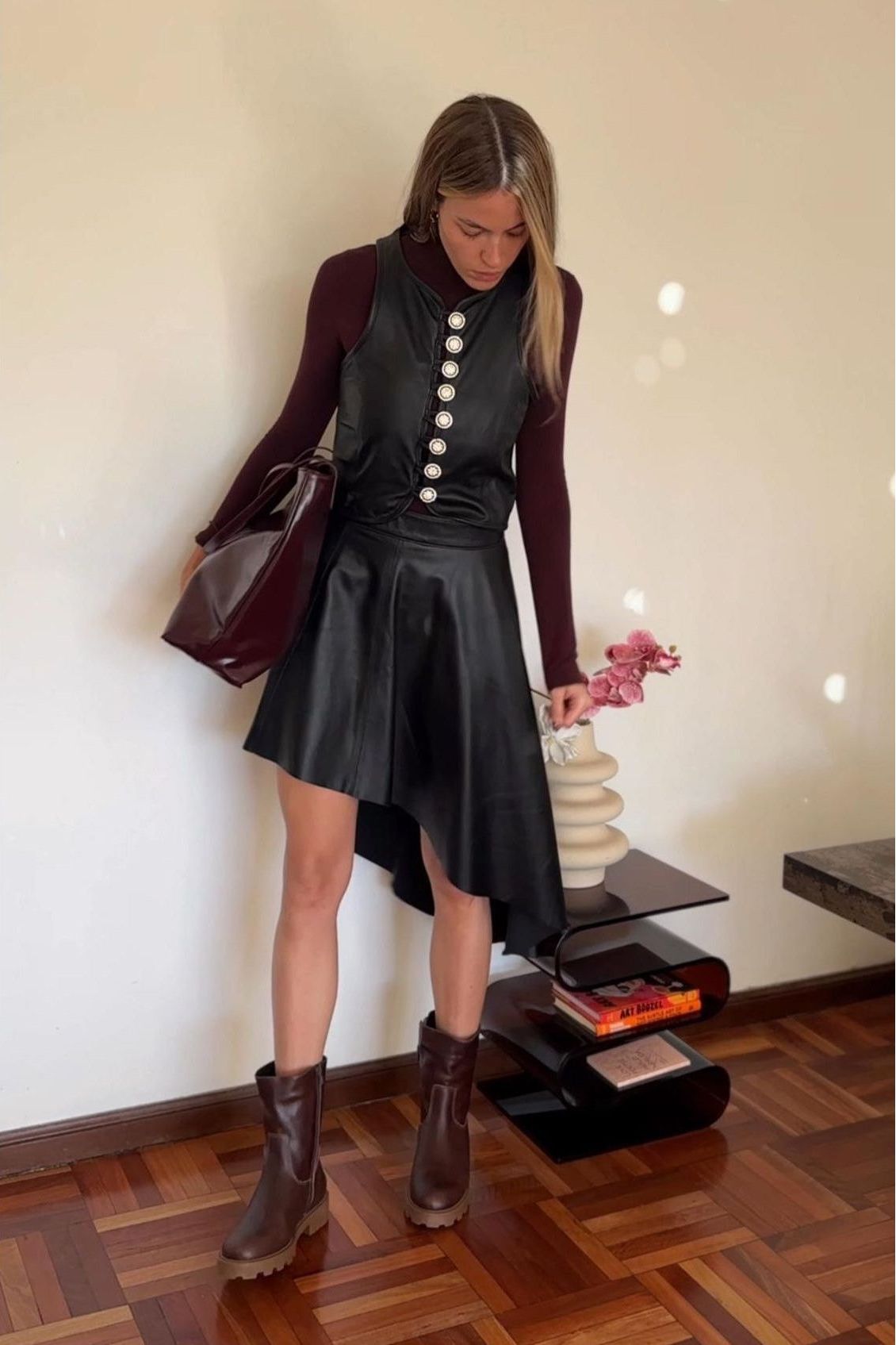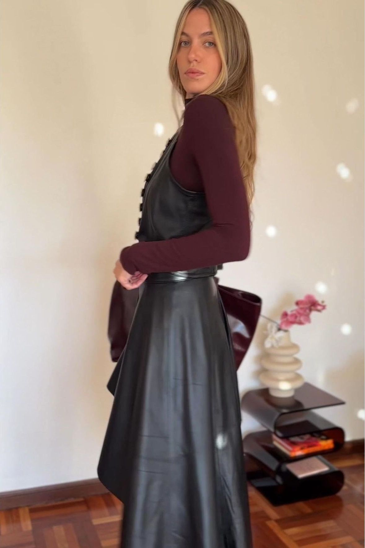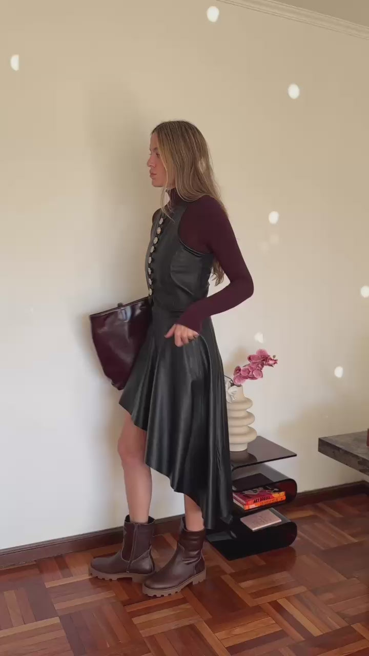 Falda asimétrica con diseño irregular, más corto en el lateral y con una caída más larga del otro. Tiene movimiento que le da frescura y a su vez tiene un toque elegante.