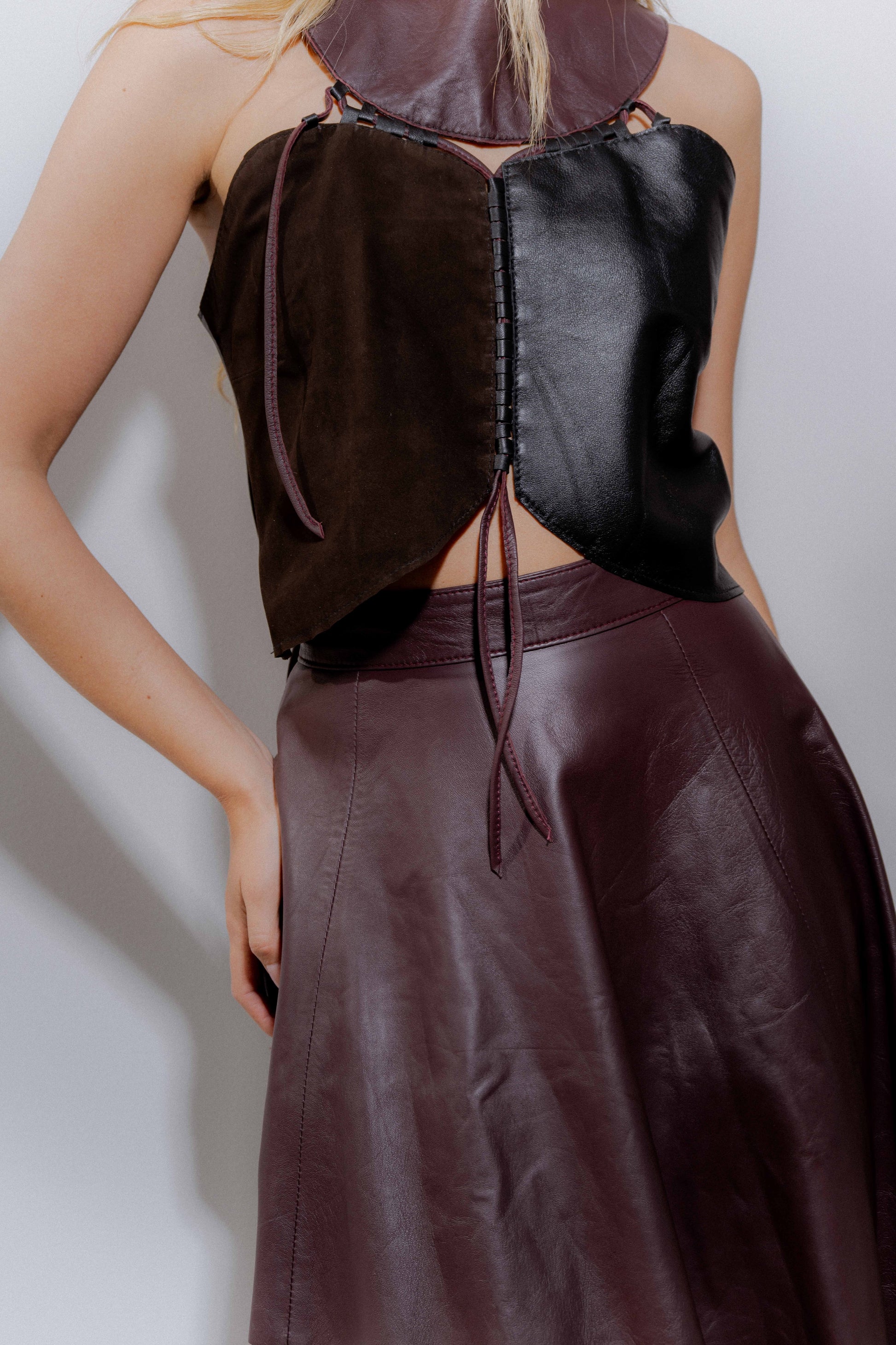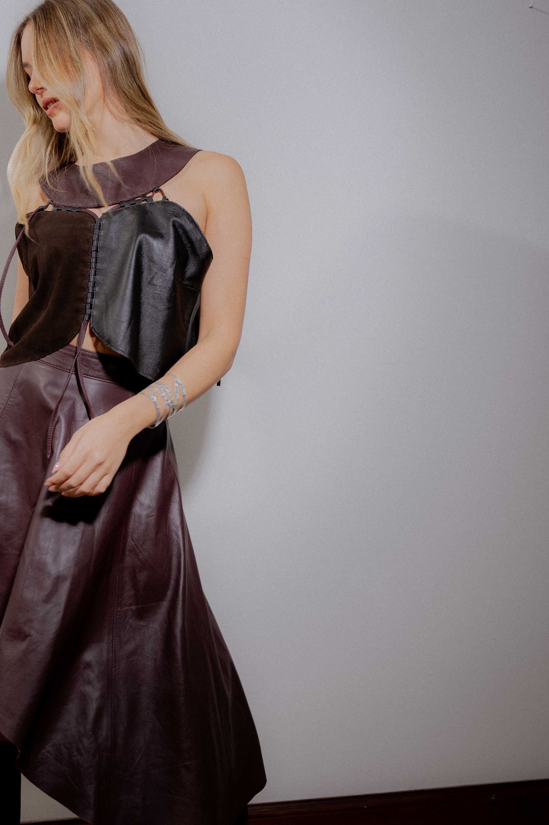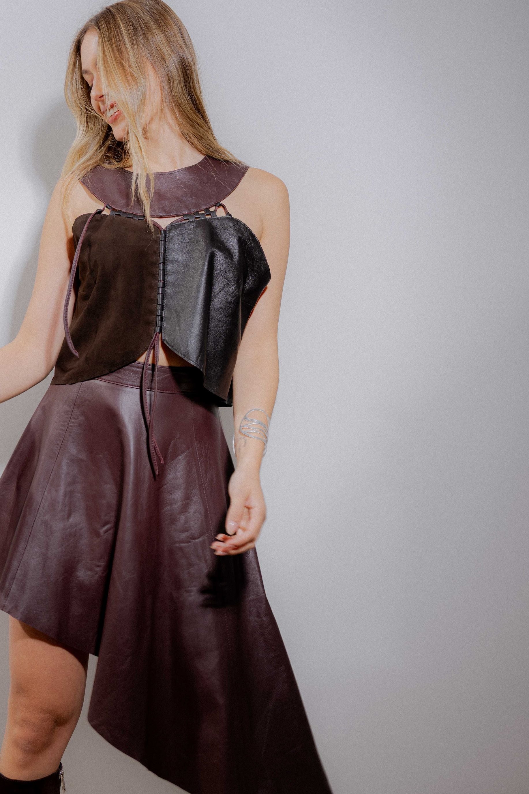 Falda asimétrica con diseño irregular, más corto en el lateral y con una caída más larga del otro. Tiene movimiento que le da frescura y a su vez tiene un toque elegante.