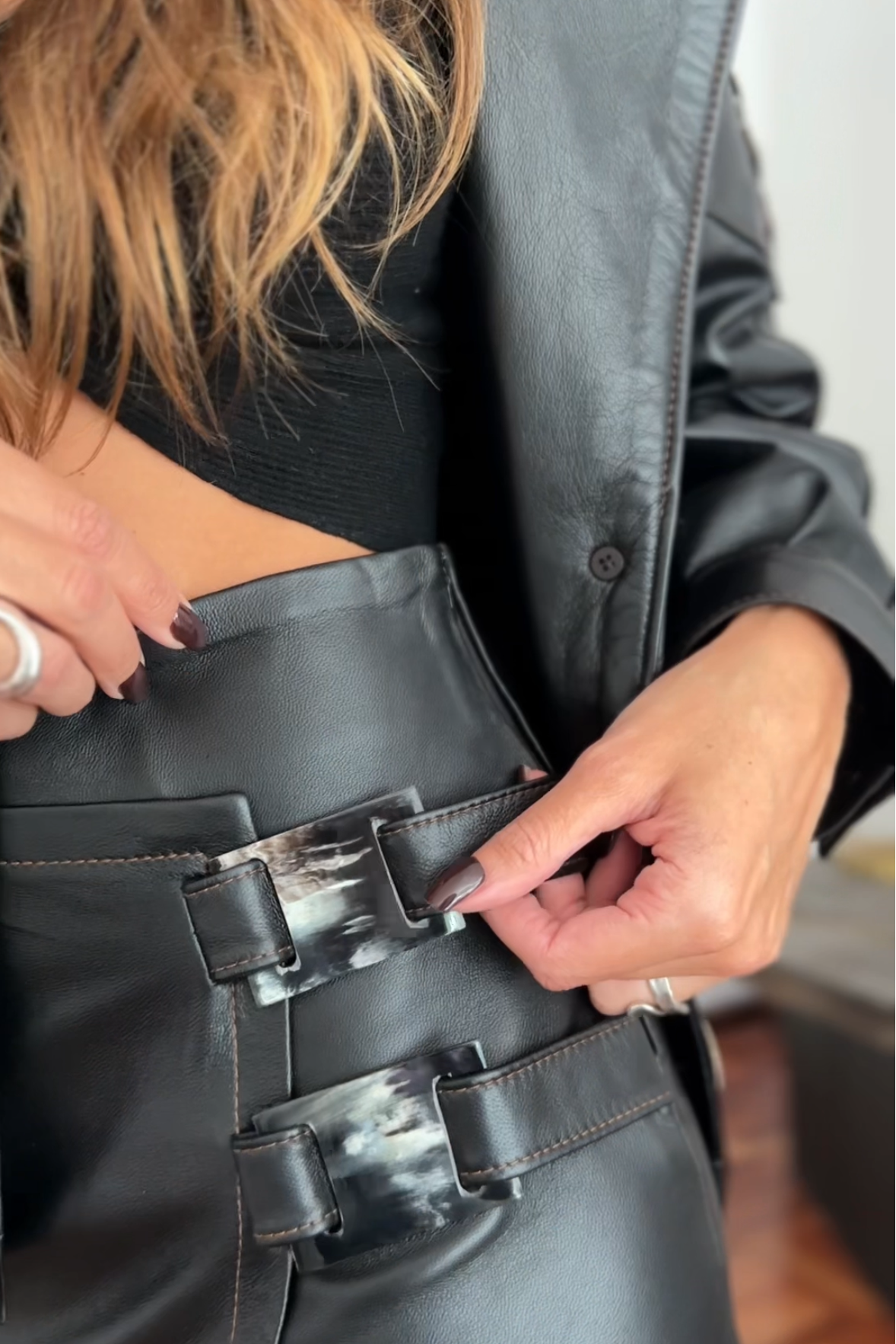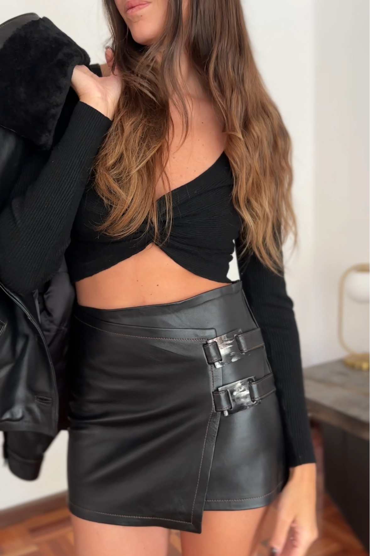 Falda en cuero ovino negra de tiro bajo con hebillas en guampa.