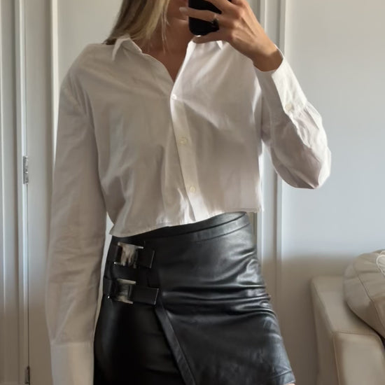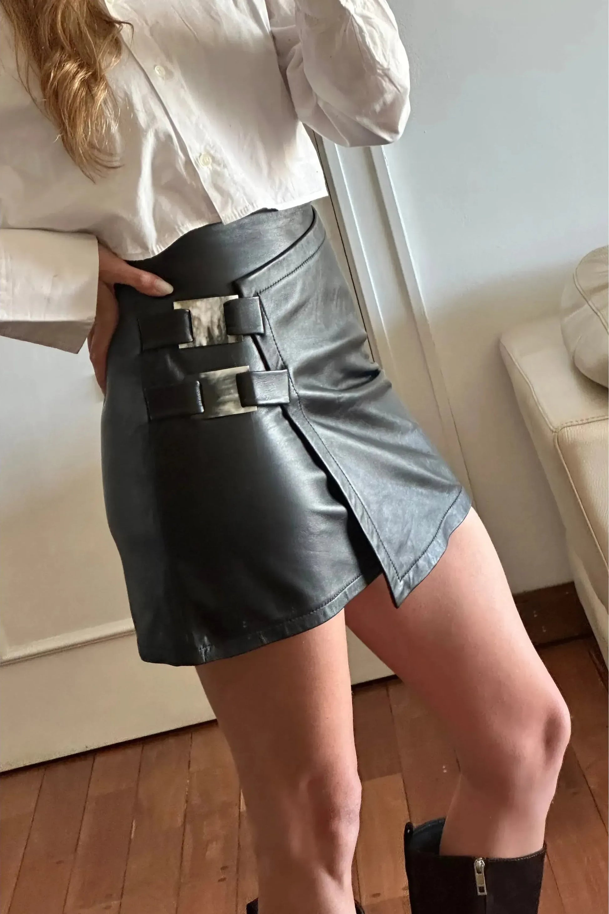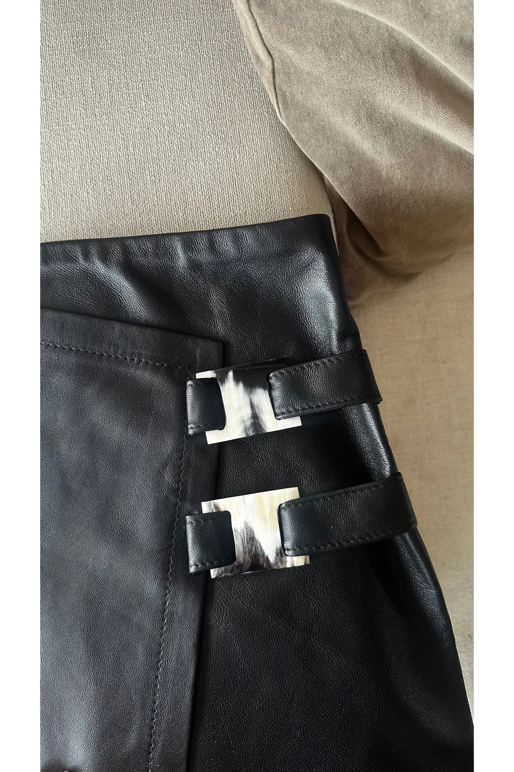 Falda en cuero ovino negra de tiro alto con hebillas en guampa.