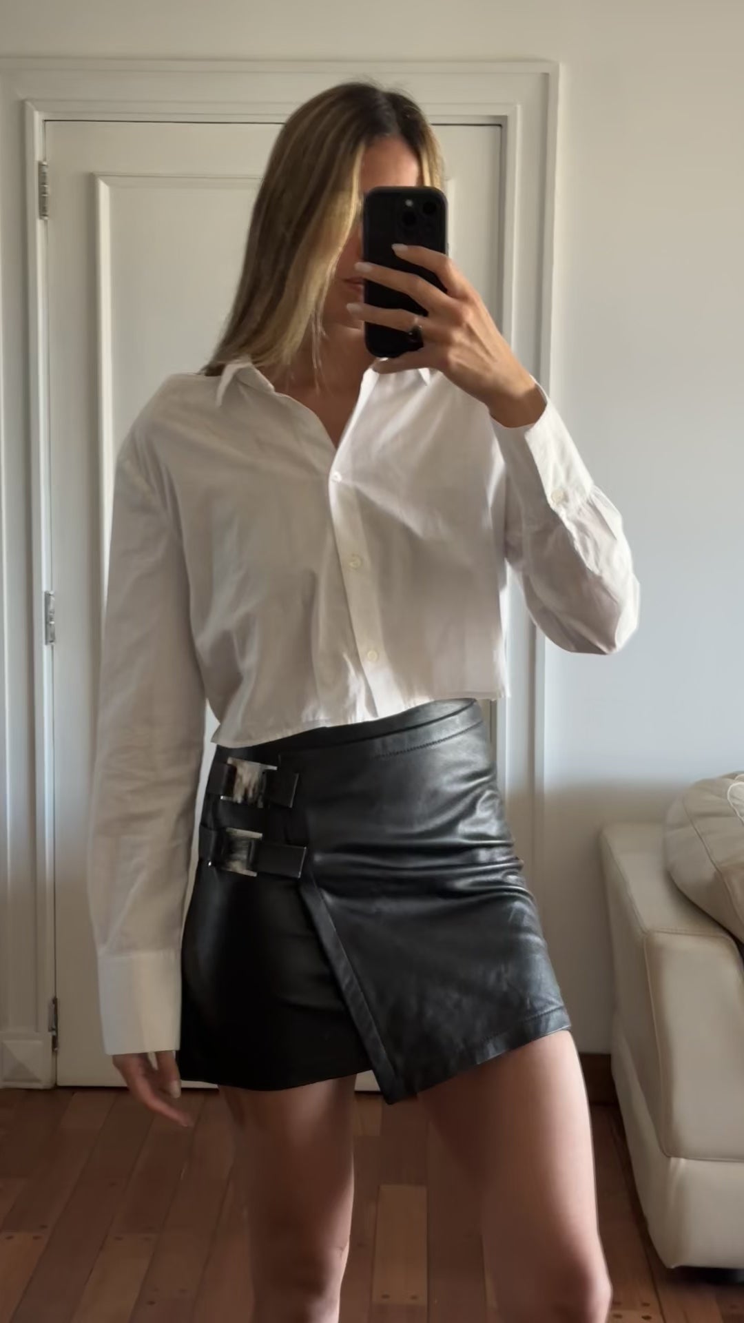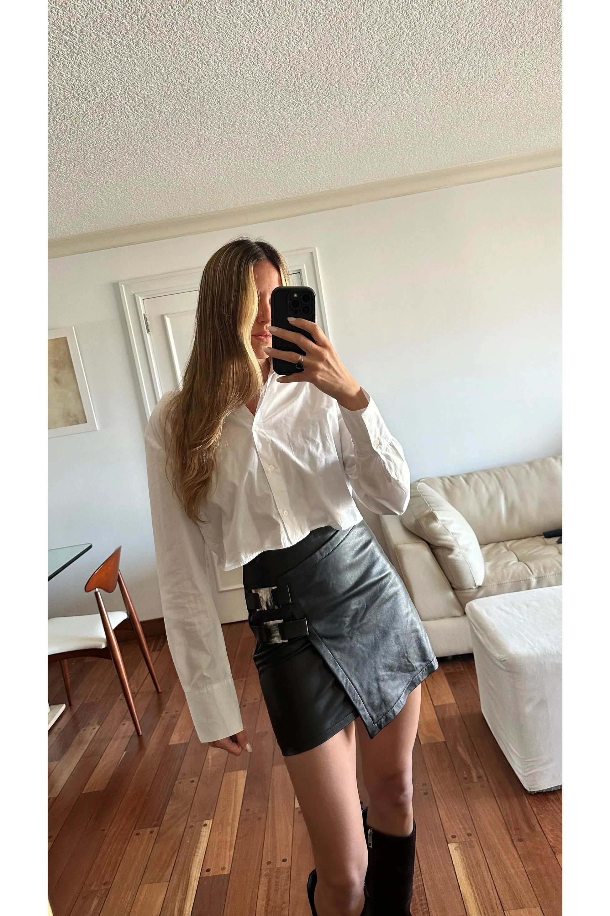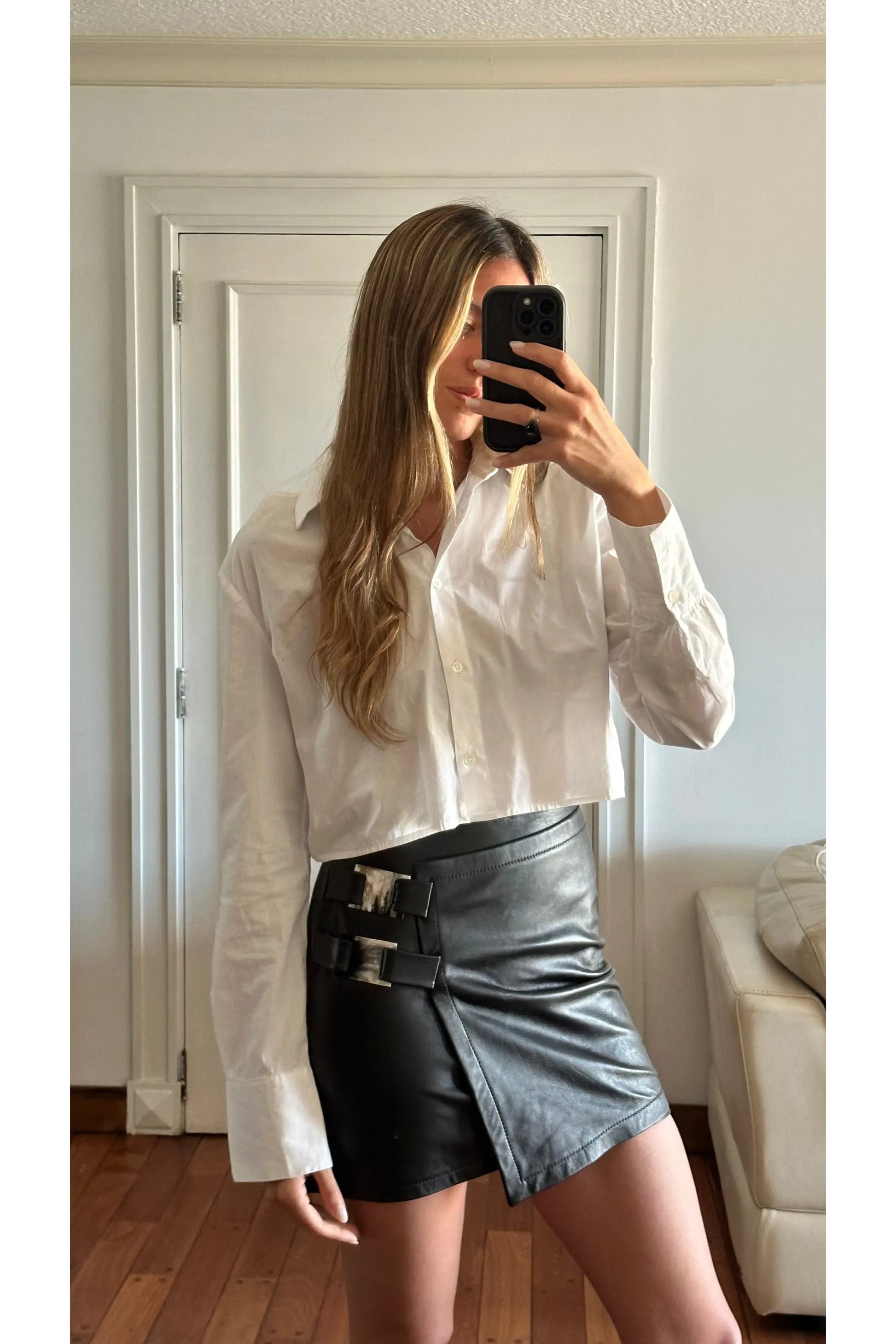 Falda en cuero ovino negra de tiro alto con hebillas en guampa.