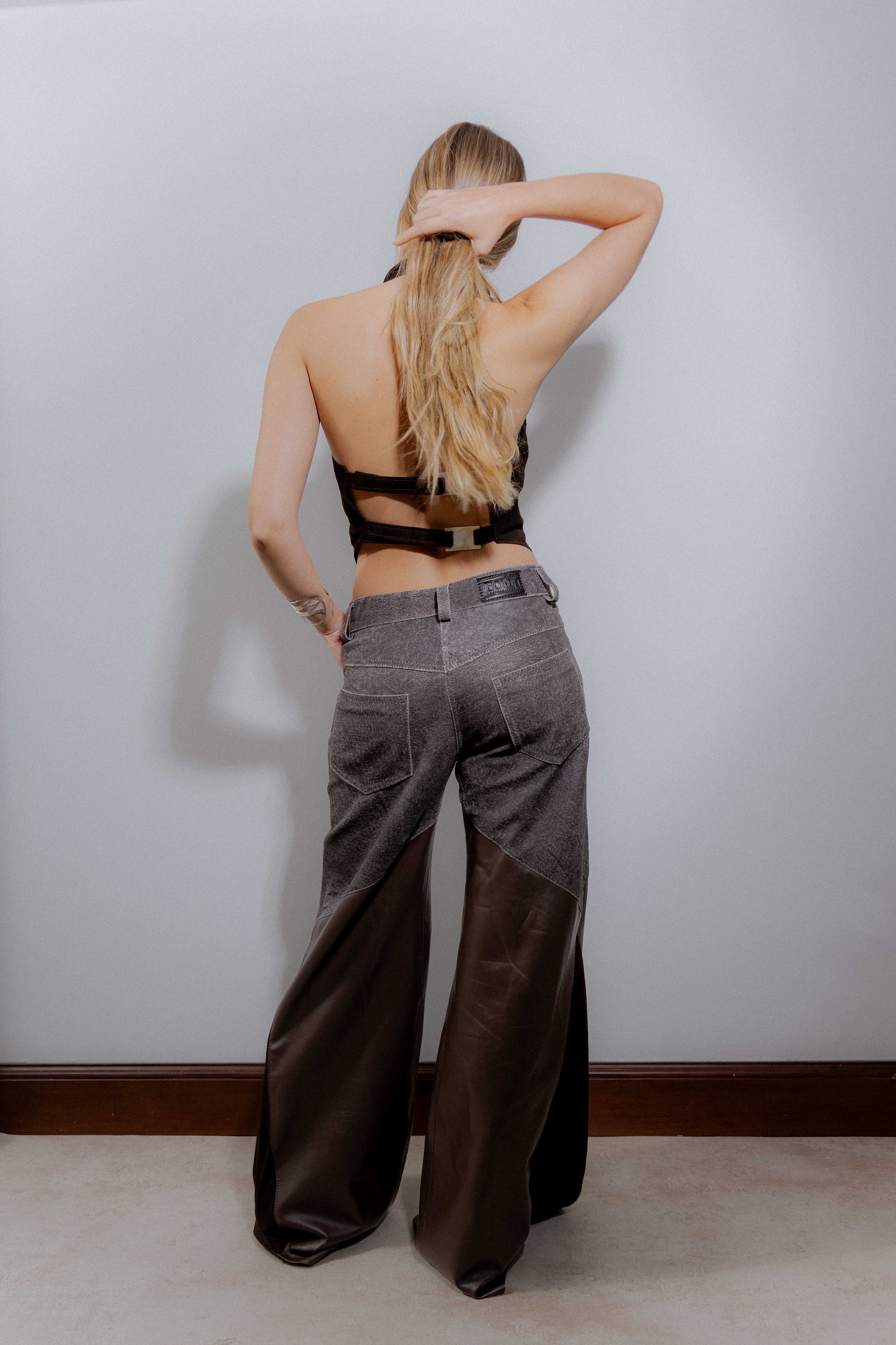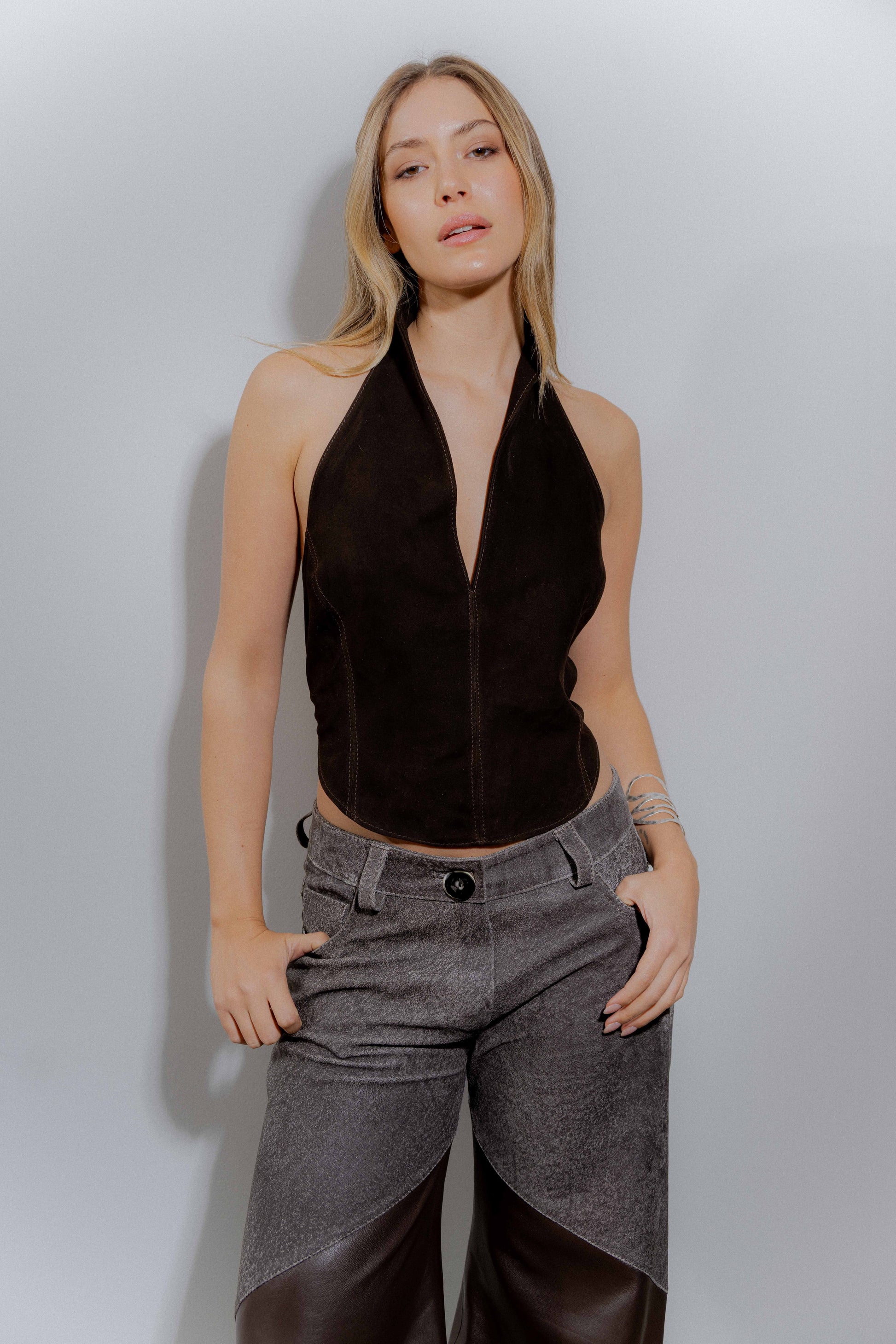 Top Cat en gamuza suave y muy fina marrón con hebillas de guampa que resaltan la espalda.