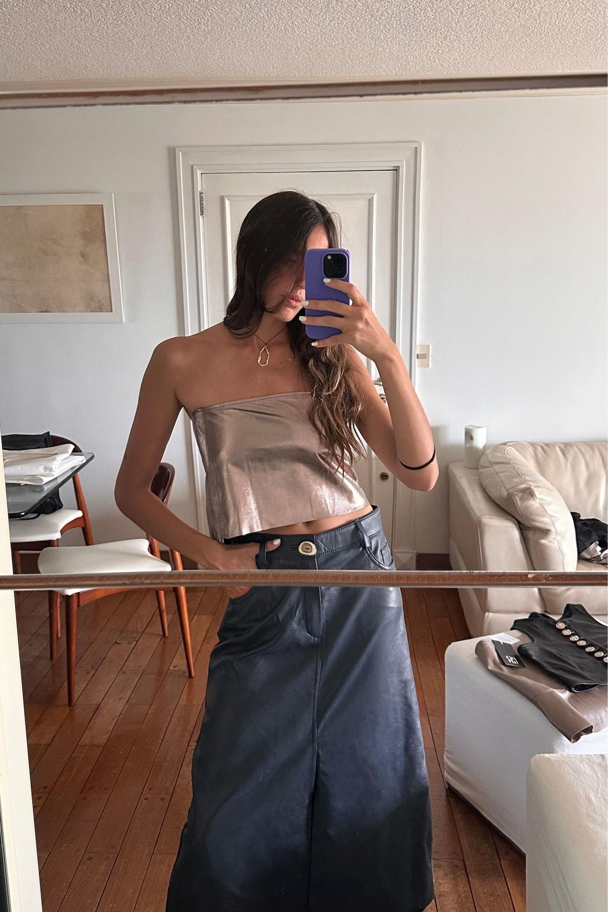 Top en cuero ovino platino ideal para matchear en set con la falda o para levantar cualquier outfit casual.