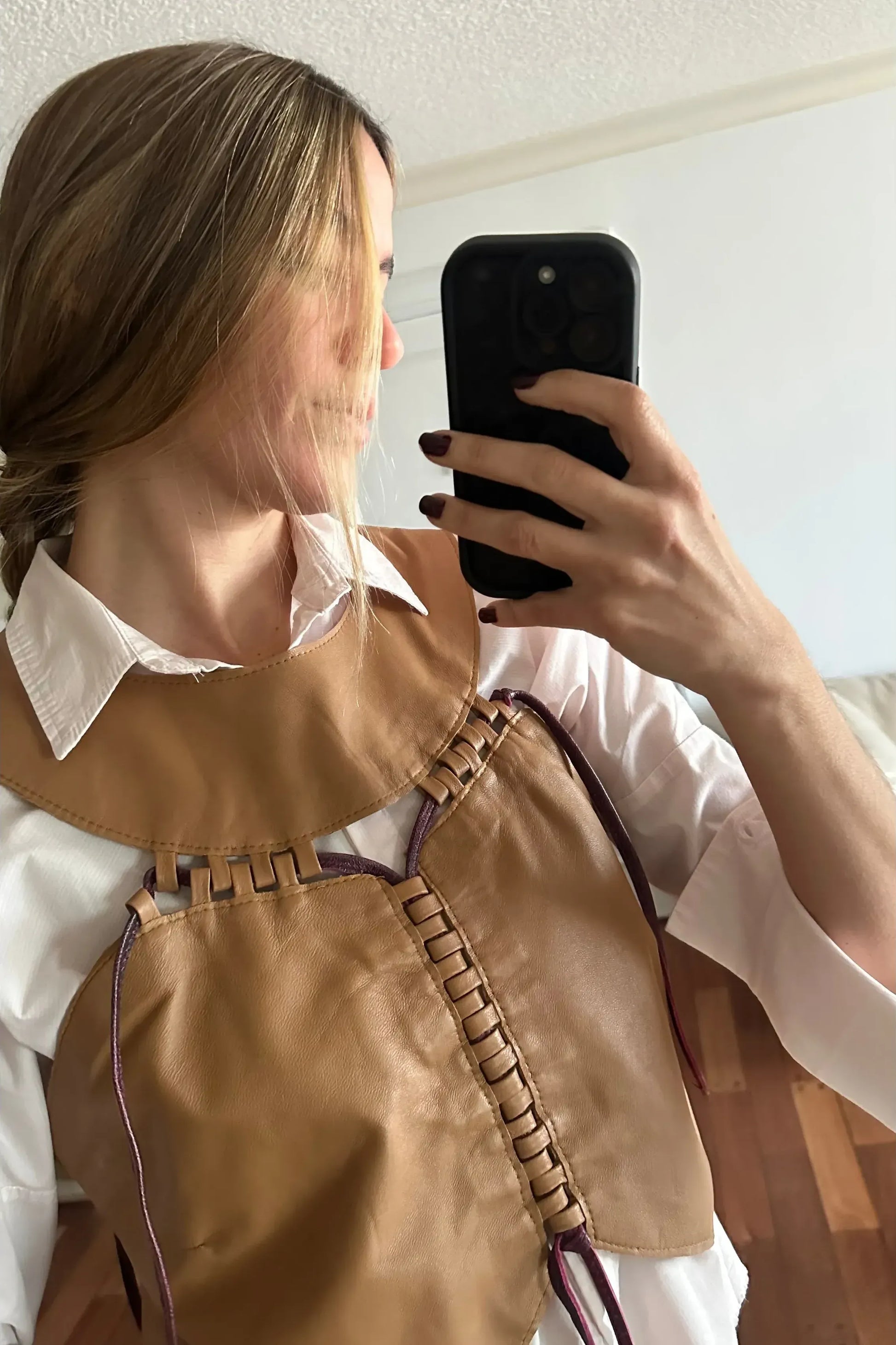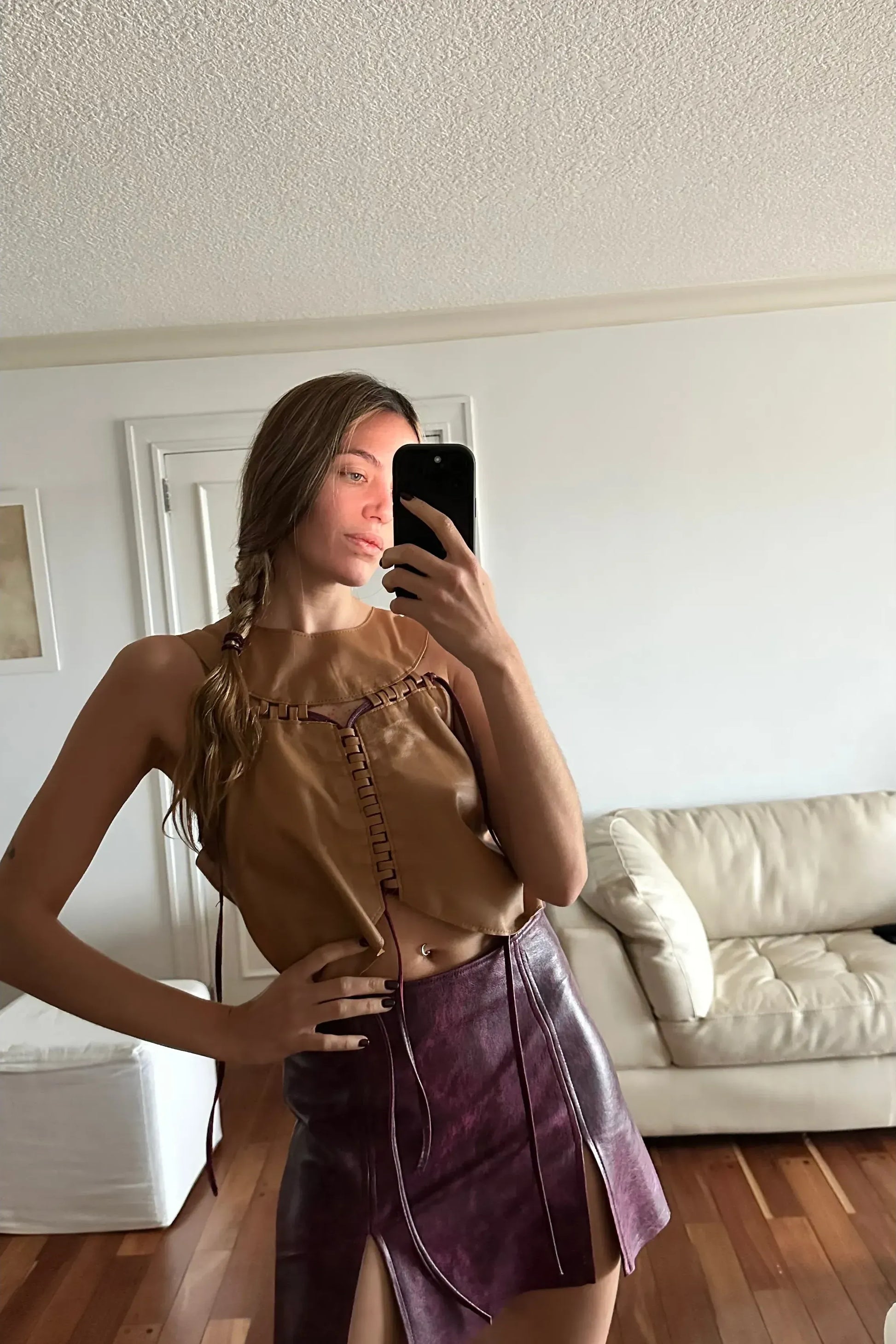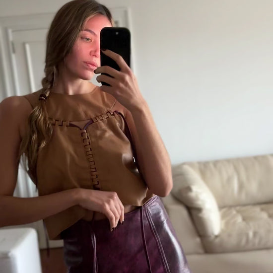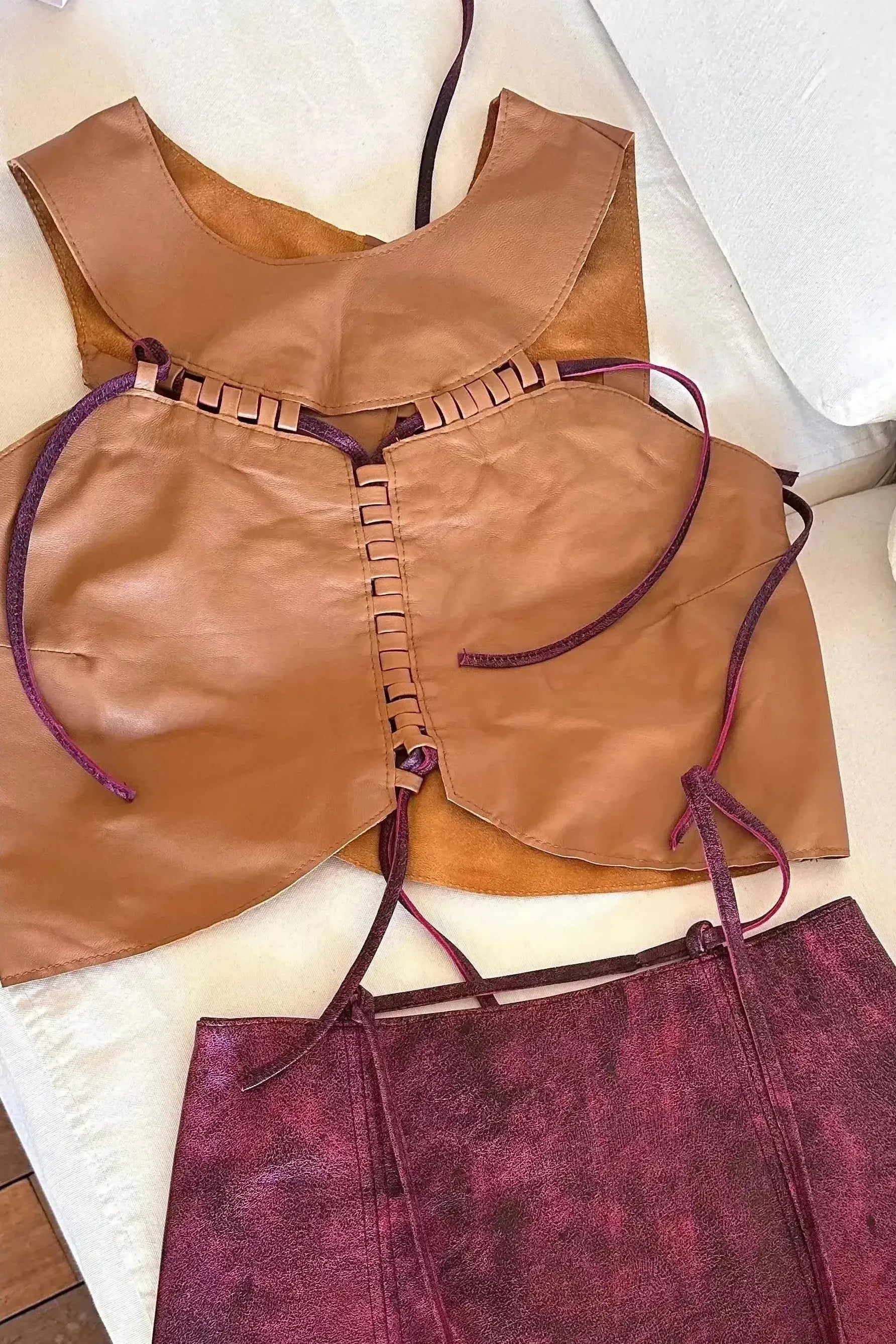 Top en cuero caramelo ovino con detalles artesanales en pasamanería color fucsia vintage. Ideal para matchear con la falda Fragmentos cuero vintage fucsia.