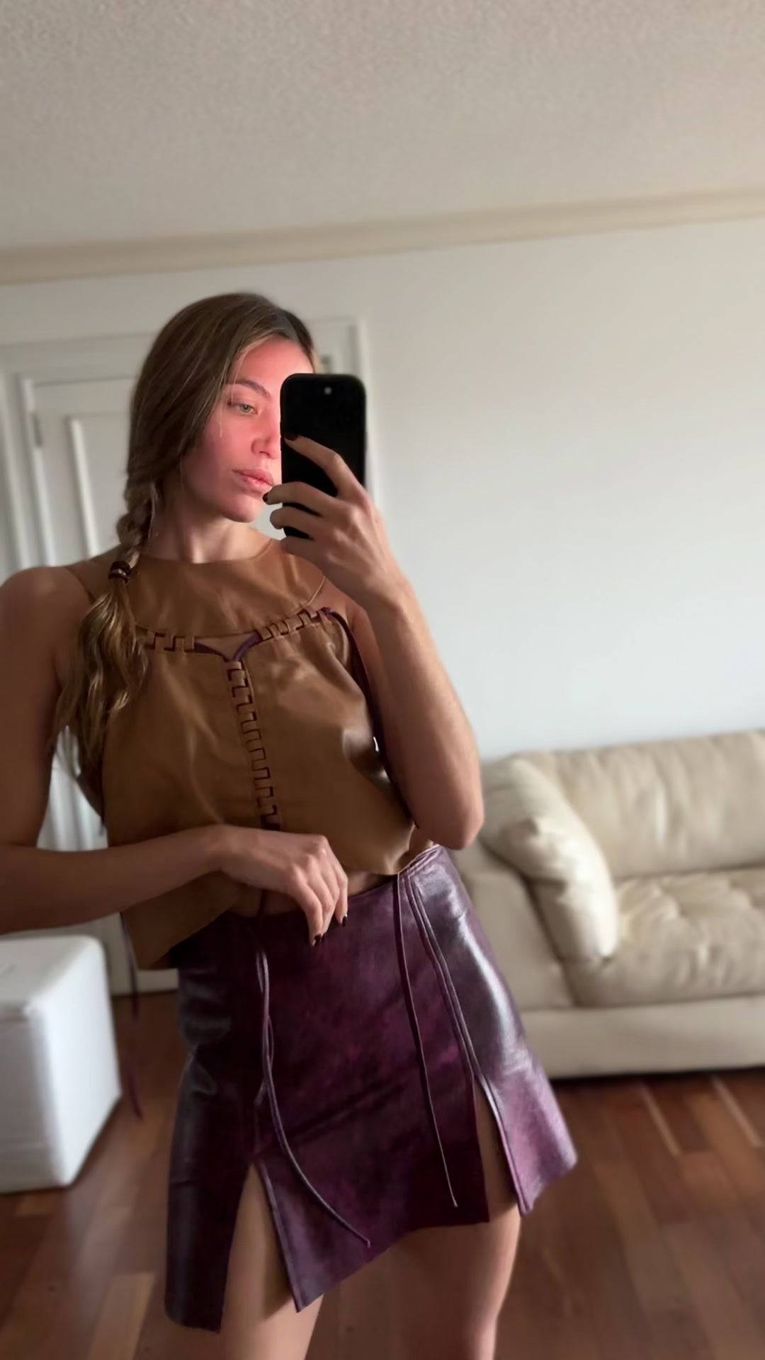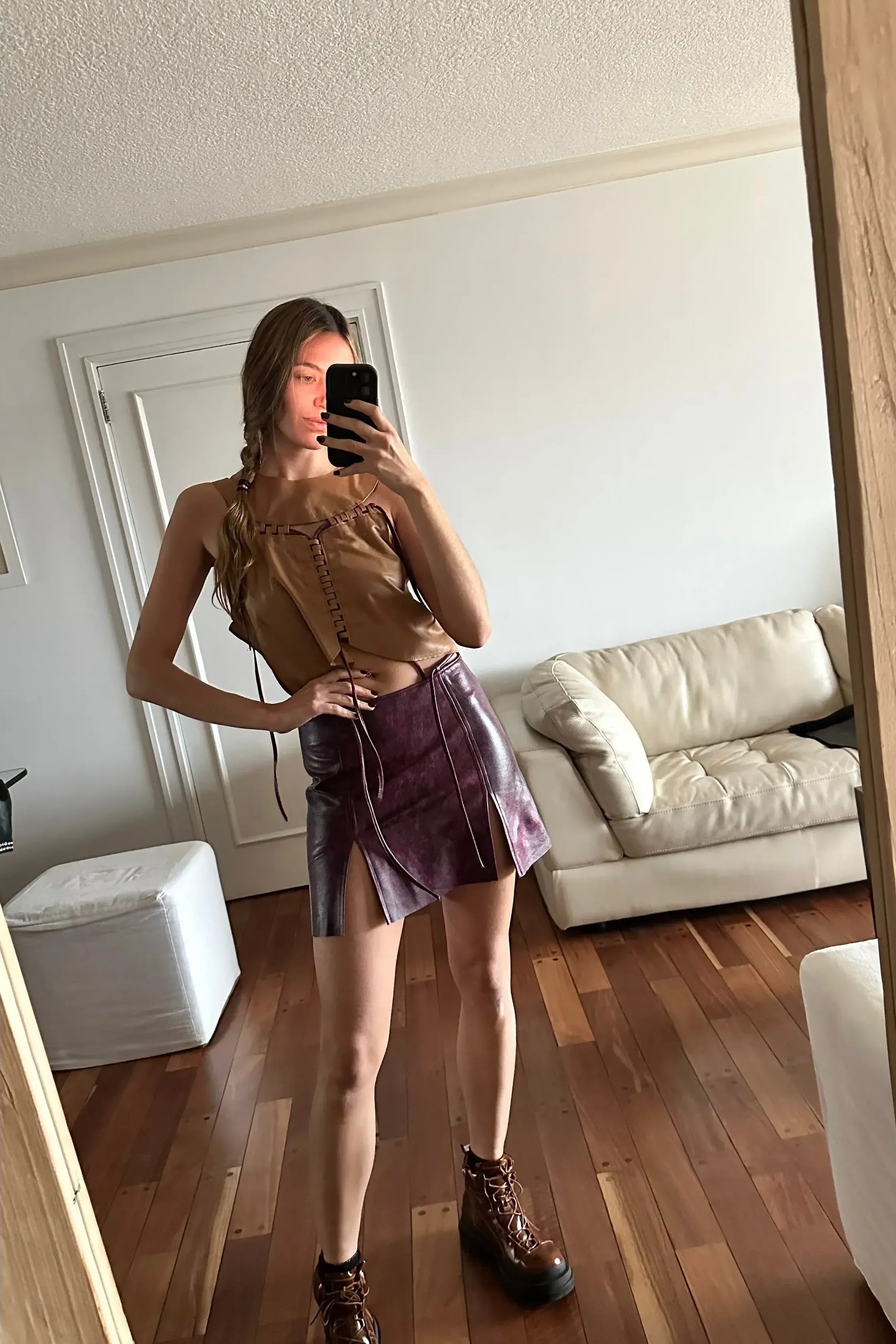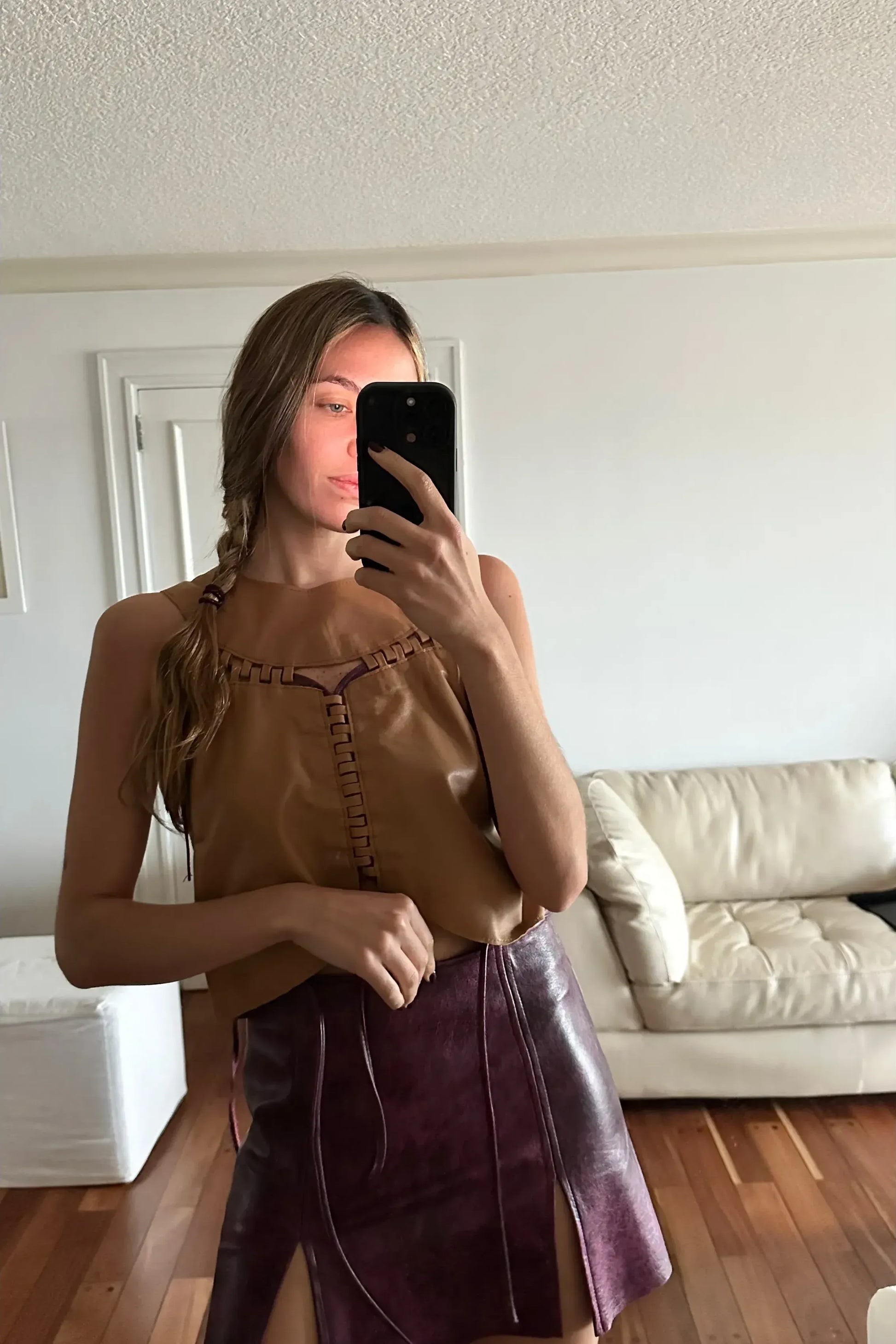 Top en cuero caramelo ovino con detalles artesanales en pasamanería color fucsia vintage. Ideal para matchear con la falda Fragmentos cuero vintage fucsia.