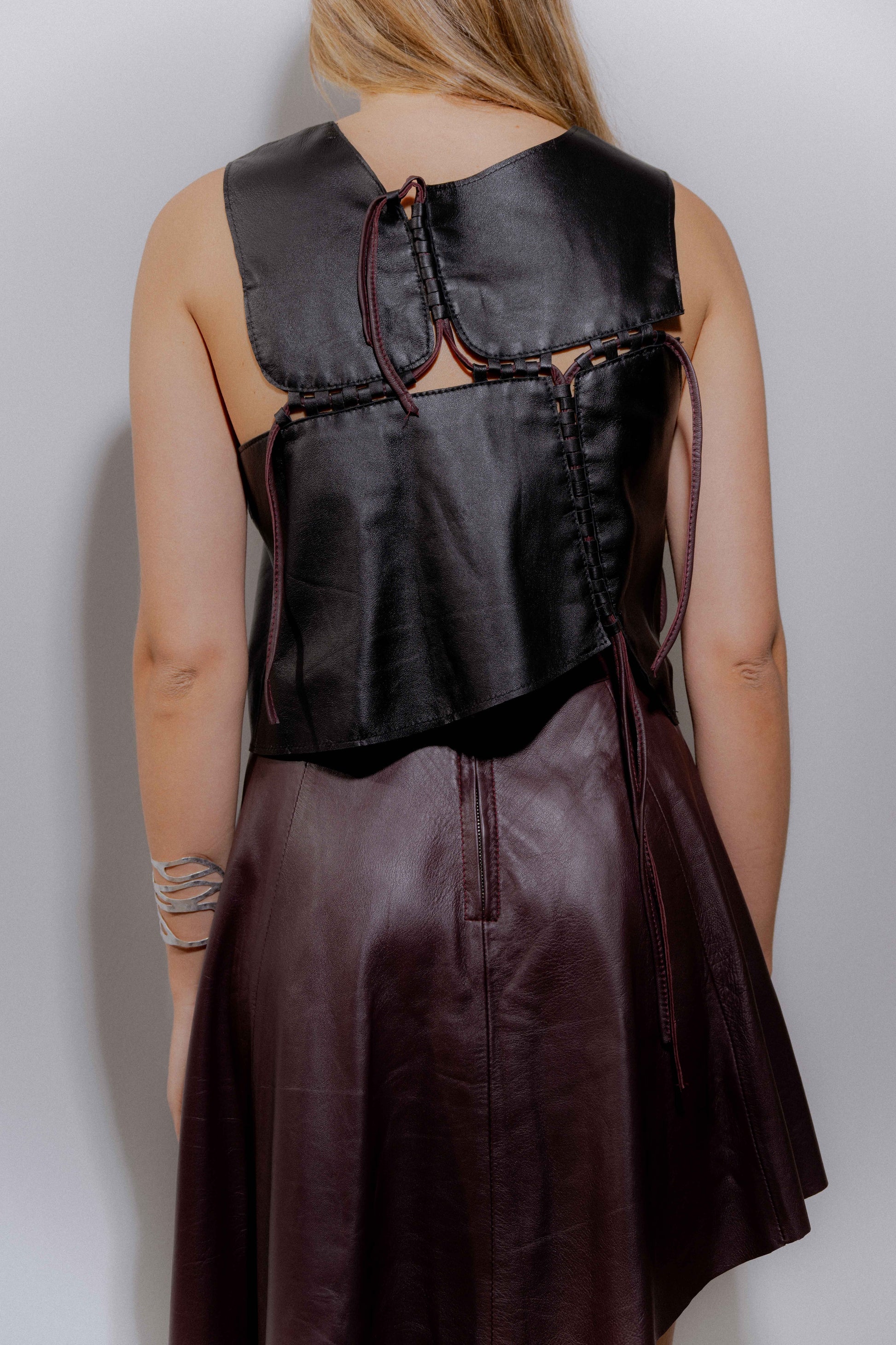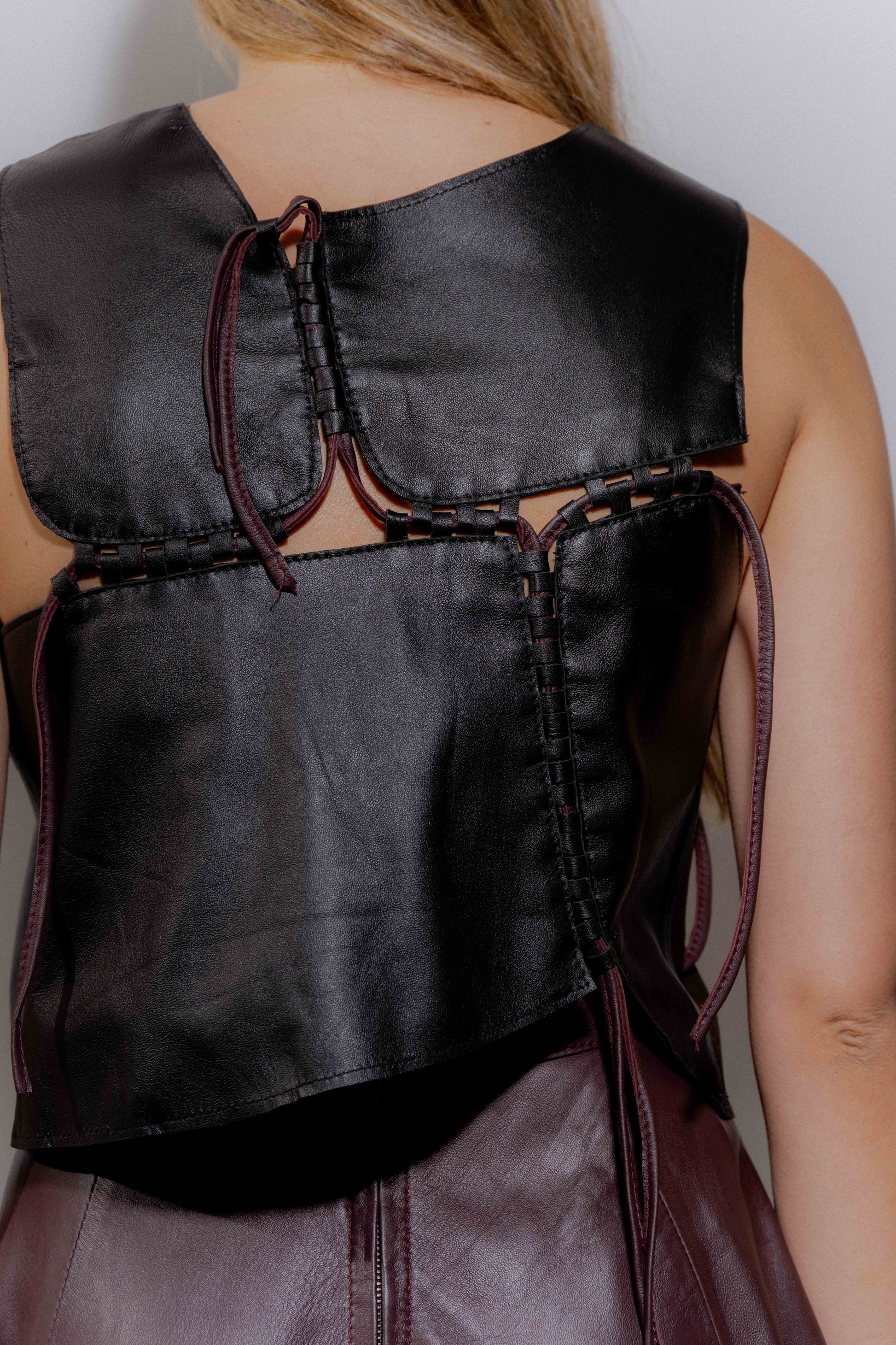 Top en 3 tonos de cuero ovino y gamuza: vino, negro y gamuza chocolate con detalles en pasamanería color vino.