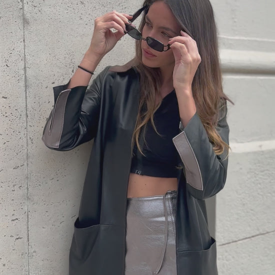 Tapado largo con cuello desmontable y detalles en manga color peltre. Ideal para cualquier ocasión. El cuello desmontable es reversible, de un lado peltre y del otro marrón.