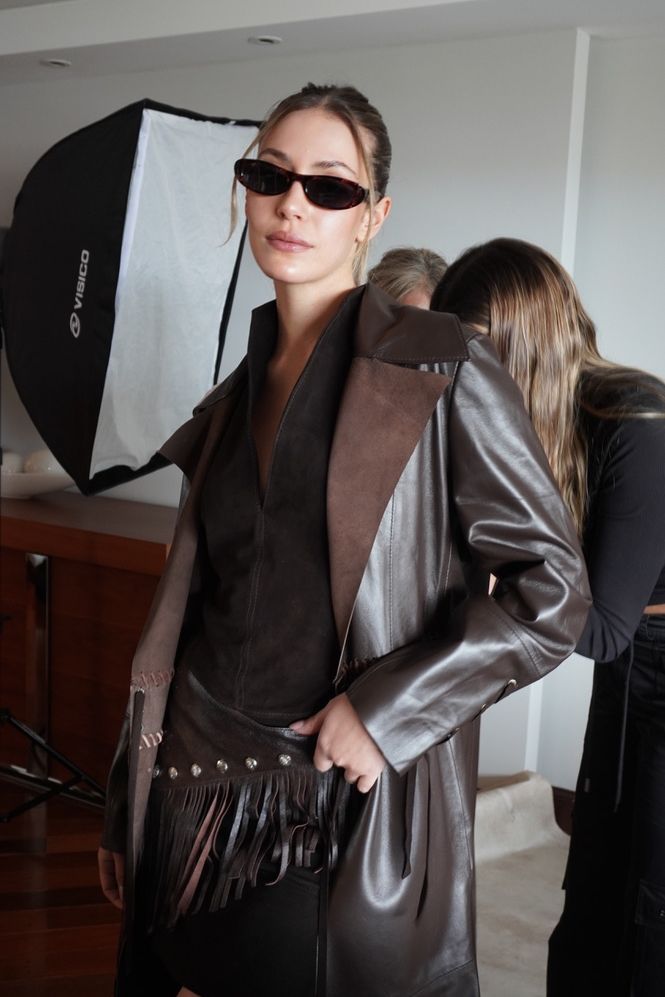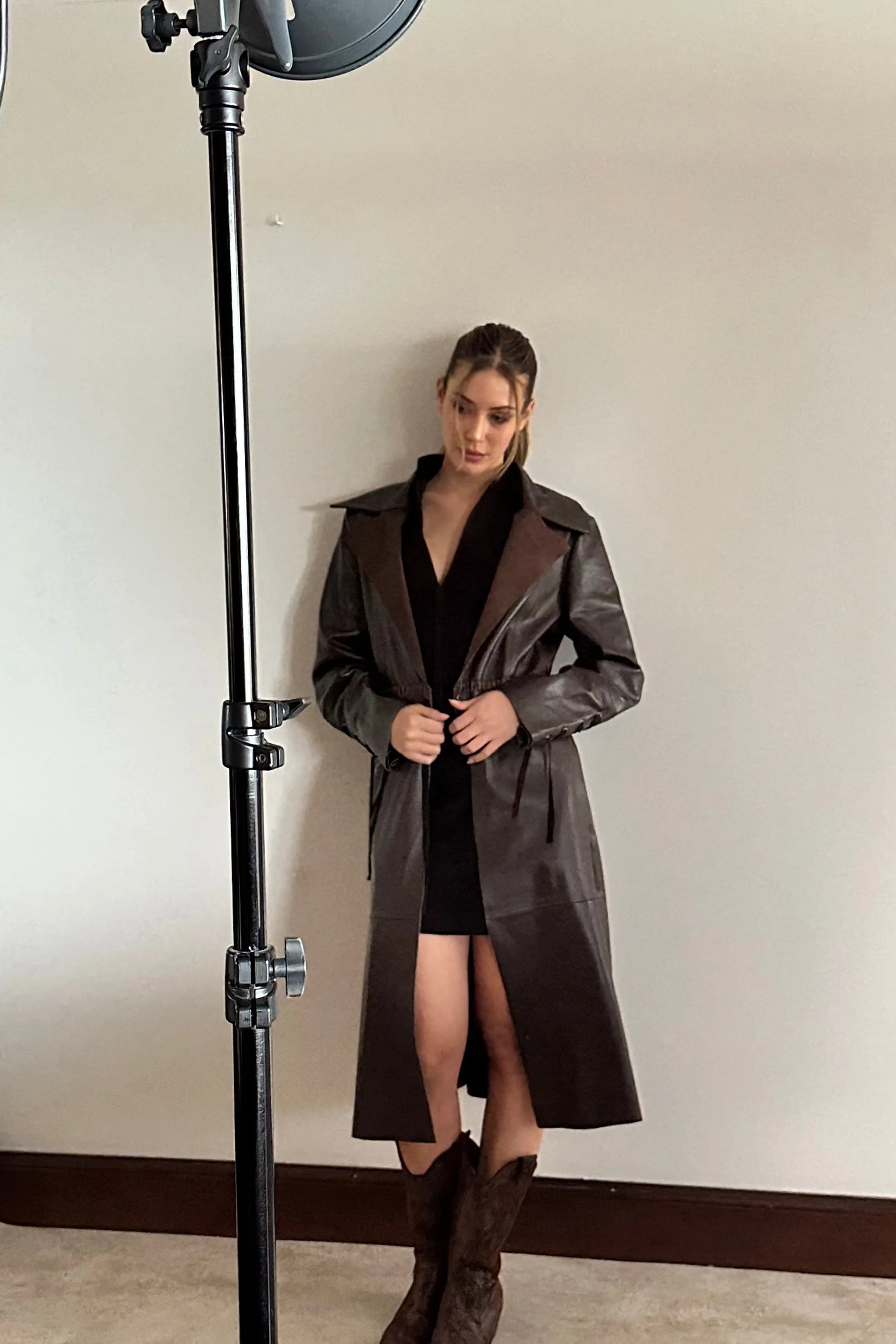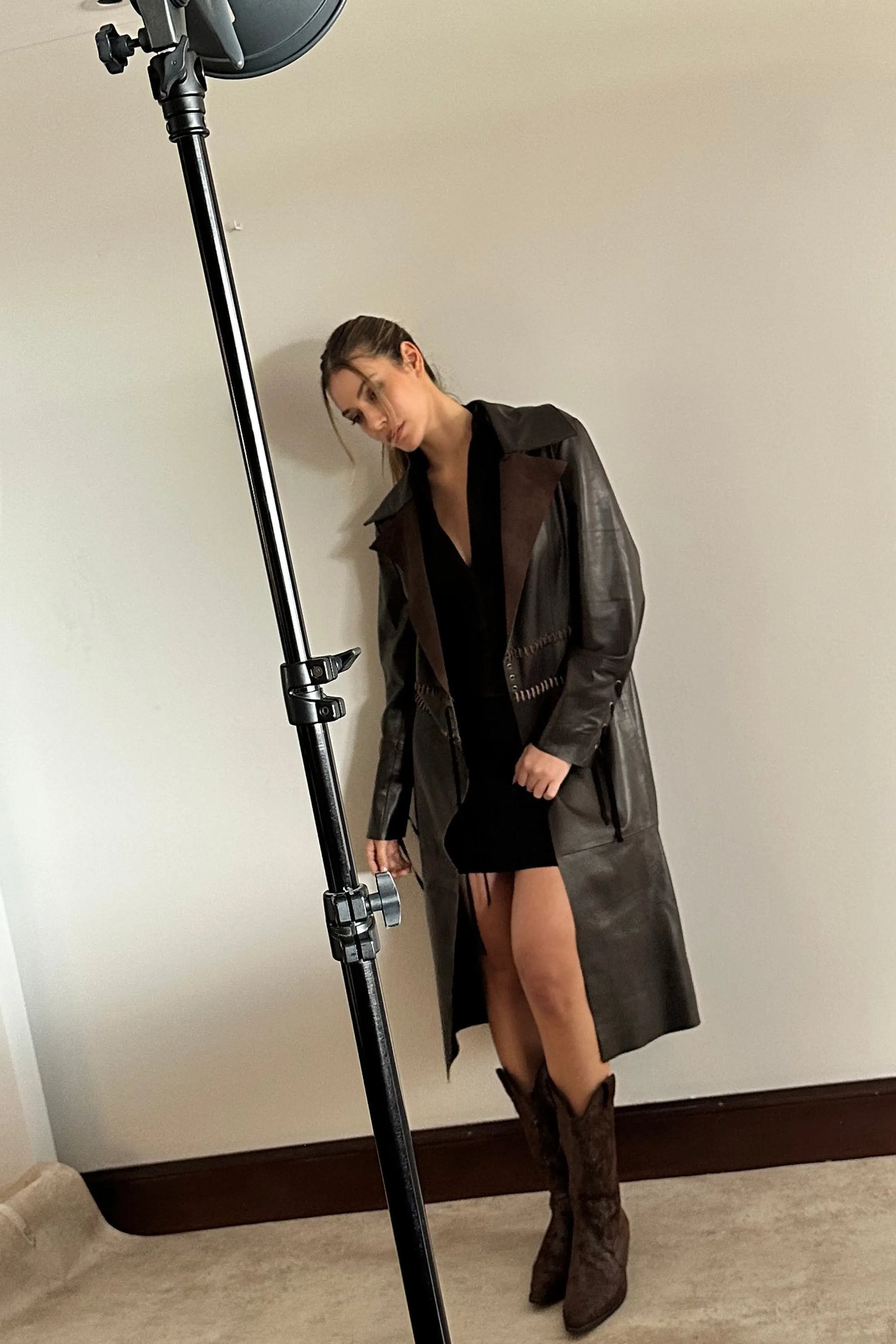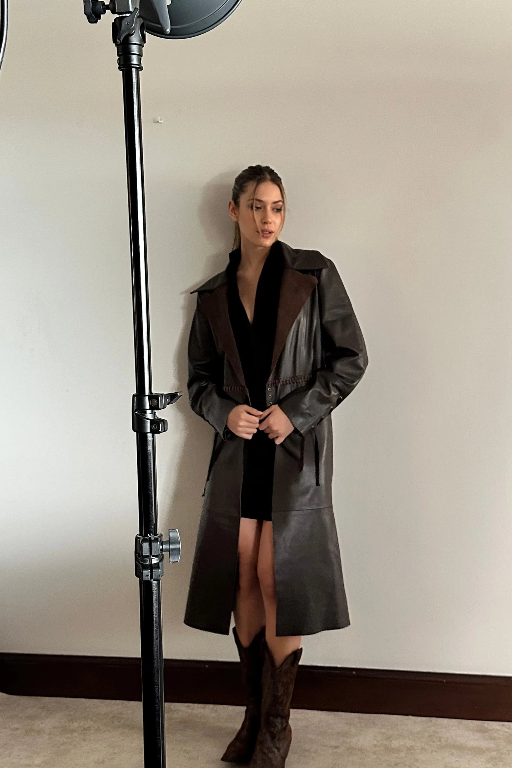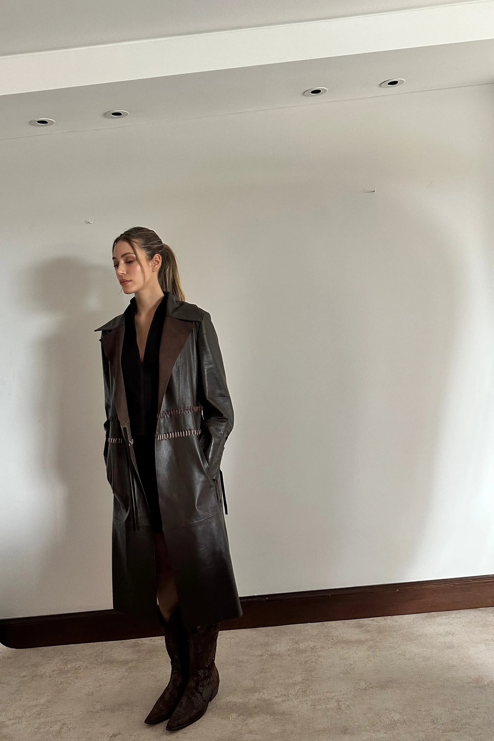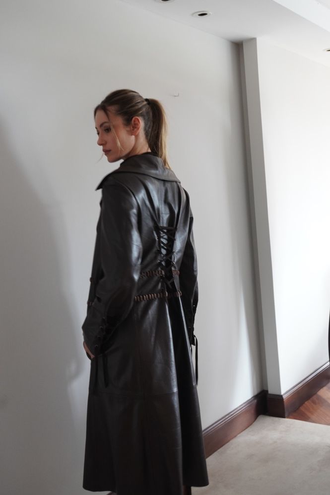 Trench en cuero ovino chocolate con detalles en pasamanería de cueros tonos tierra, y lazos en mangas y espalda para poder entallarlo.