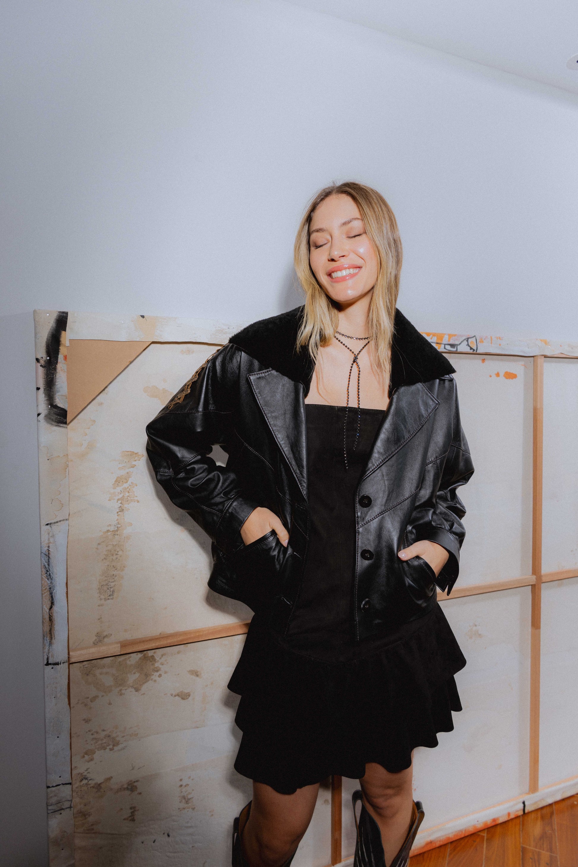 Vestido strapless en gamuza negra con volados y detalles en finas piedritas apenas brillosas en color negro.
